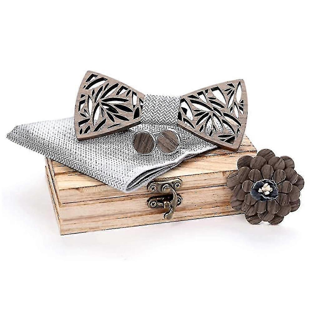 Product Material: Black walnut woodandPolyesterSize: bow tie: 12x5.5x0.45 cm square scarf: 22x22 cm corsage: 5.4cm cufflinks: 1.6 cm.Color: blue, silver, blackQuantity: 1 setPackage content: 1xbow tie, 2xcufflinks, 1xcorsage, 1xsquare scarf, 1xwooden box1.High-quality materials: This bow tie is made of black walnut wood material, which will show your elegance and personality, suitable for a variety of styles.Bow ties are made of wood, ensuring that they are always in the correct shape. It can be worn in a few seconds and fits instantly. You dont have to worry about it deforming like a fabric bow tie.2.Fashion matching: This bow tie has high-quality texture and color, which can be matched with different clothing to show a different style.3.Adjustable design: A universal, adjustable neckband design that can be adjusted according to the size of your neck, making it more comfortable to wear.High-quality elastic elastic bands give the wearer a comfortable wearing experience.4.Application range: This printed bow tie is suitable for formal events, such as weddings, parties, performances, banquets, etc., and even you can wear it daily.5.Ideal gift: This bow tie is made of high-quality materials and is an ideal gift for family, colleagues and close friends.