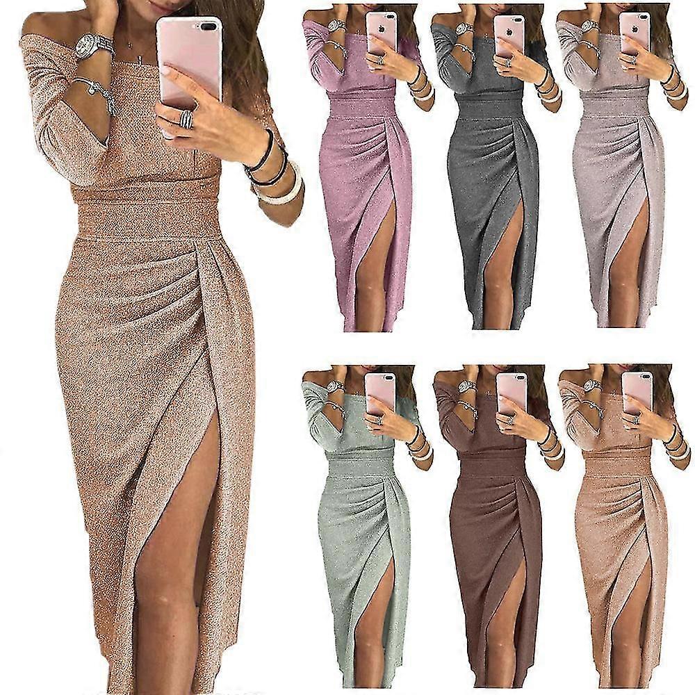 Women Girls Dress Comfortable Women's Sheath Slit Off-neck Shiny Dinnerzz44