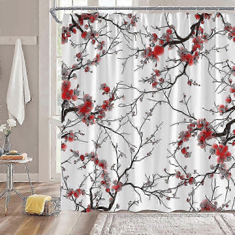 Cherry Blossom Shower Curtain Red Floral Asian Japanese Flower Plum Asian Aesthetic Traditional Nature Fabric Bathroom Decor Curtain w