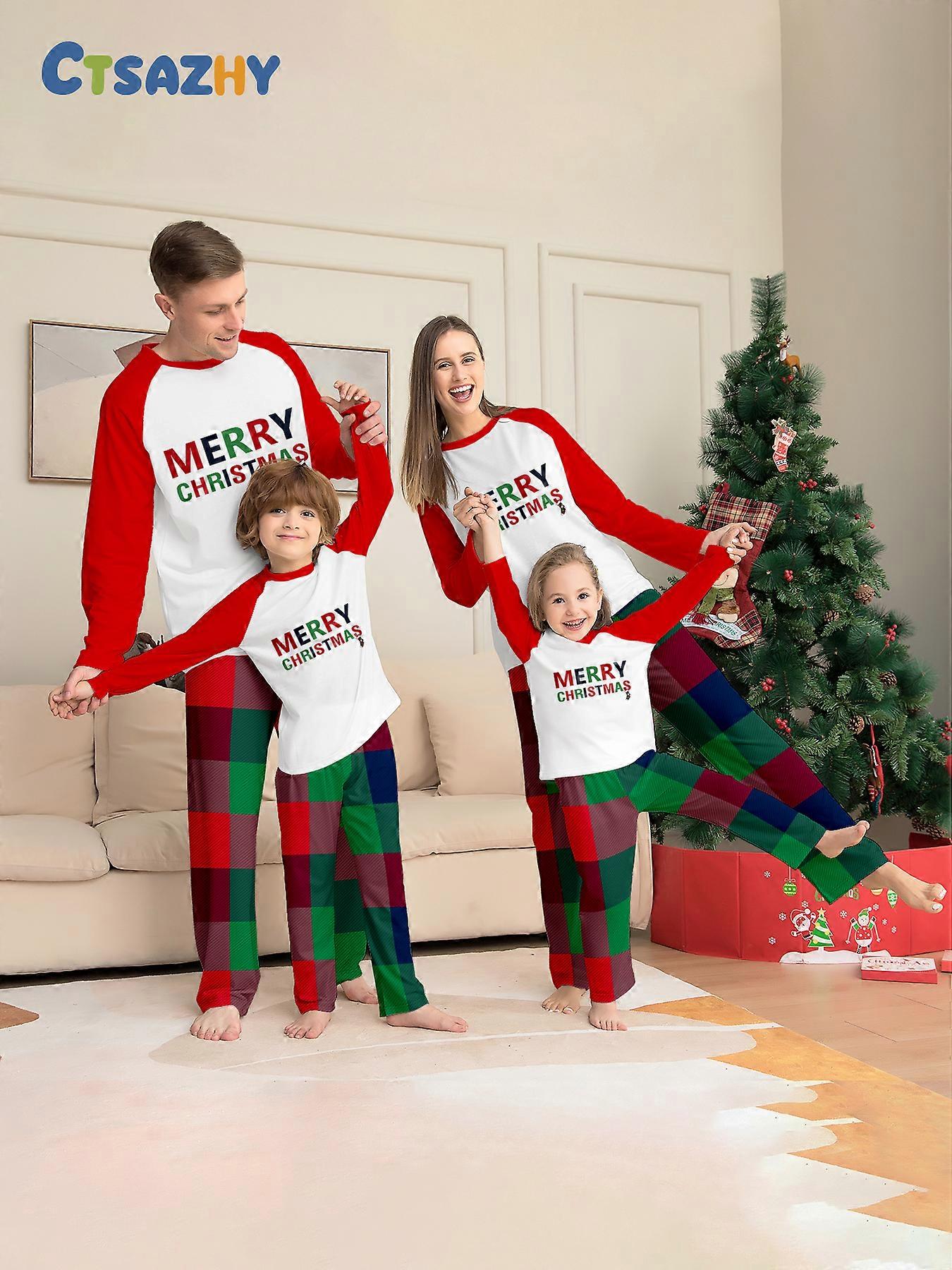 Casual Christmas Family Matching Pajamas Set for Boys & Girls, "MERRY CHRISTMAS" Print Raglan Sleeve Red Green Plaid Sleepwear