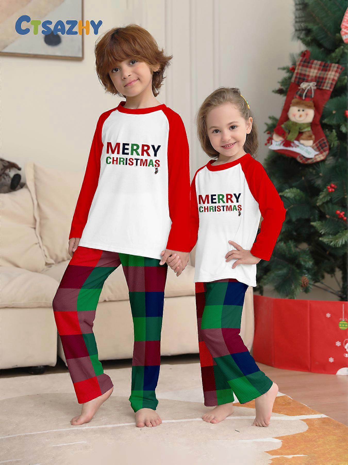 Casual Christmas Kids Sleepwear Set for Boys & Girls, "MERRY CHRISTMAS" Raglan Sleeve Red Green Plaid Pajamas