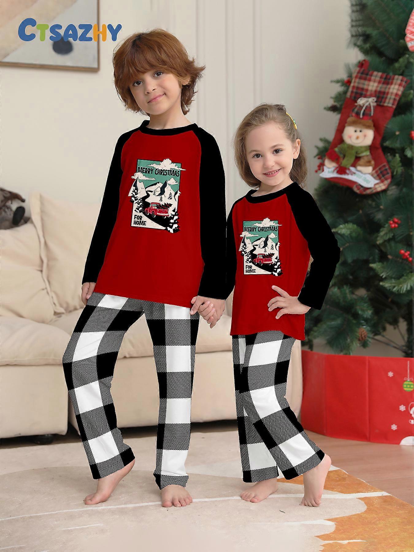 Christmas Kids Pajamas Set "MERRY CHRISTMAS FOR HOME" Print Raglan Sleeve Red Black Top Black White Plaid Sleepwear