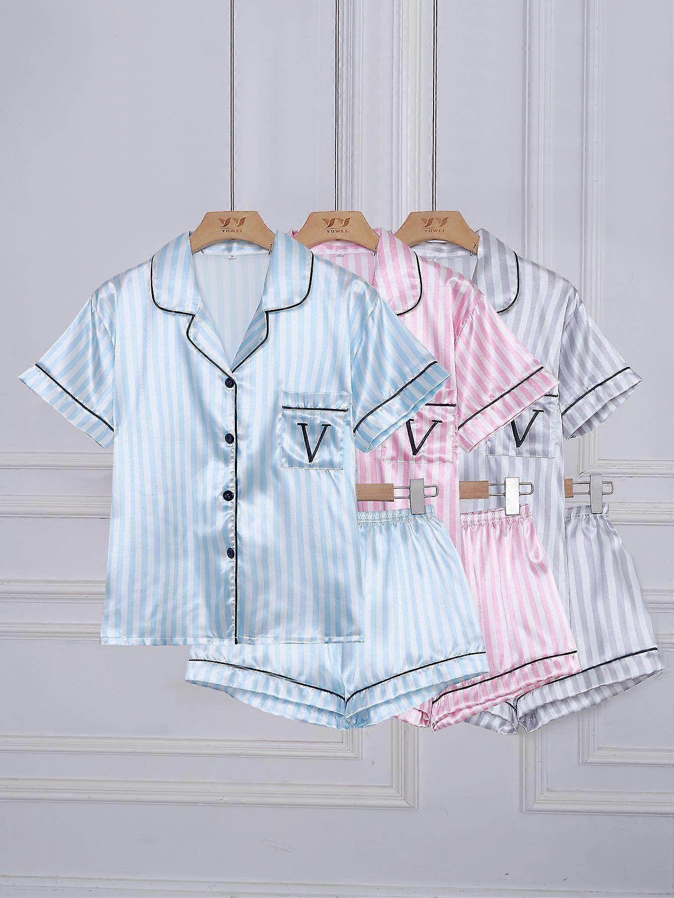 3 Sets Striped Embroidered Letter Pocket Pajama Set,Short Sleeve and Shorts Casual Satin Sleepwear with Lapel Collar and Button
