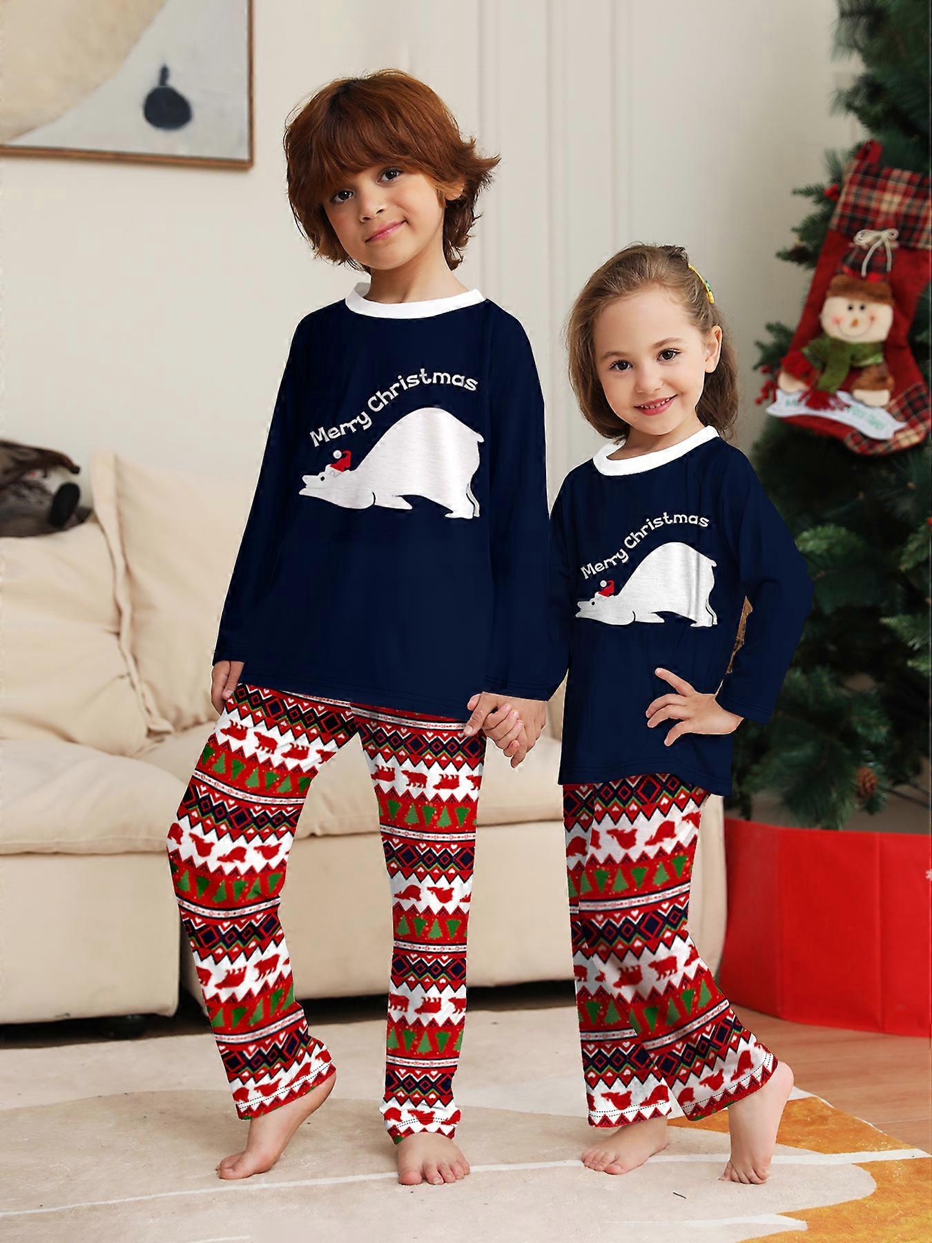 Christmas Kids Pajamas Set for Boys & Girls, Polar Bear "Merry Christmas" Print Navy Top & Red Green Tribal Stripes Sleepwear