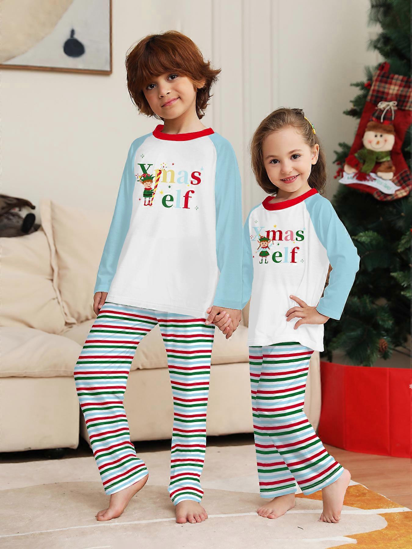 Casual Christmas Kids Pajamas Set for Boys & Girls, Xmas Elf Print Raglan Sleeve Blue Red & Red Green Stripes Sleepwear