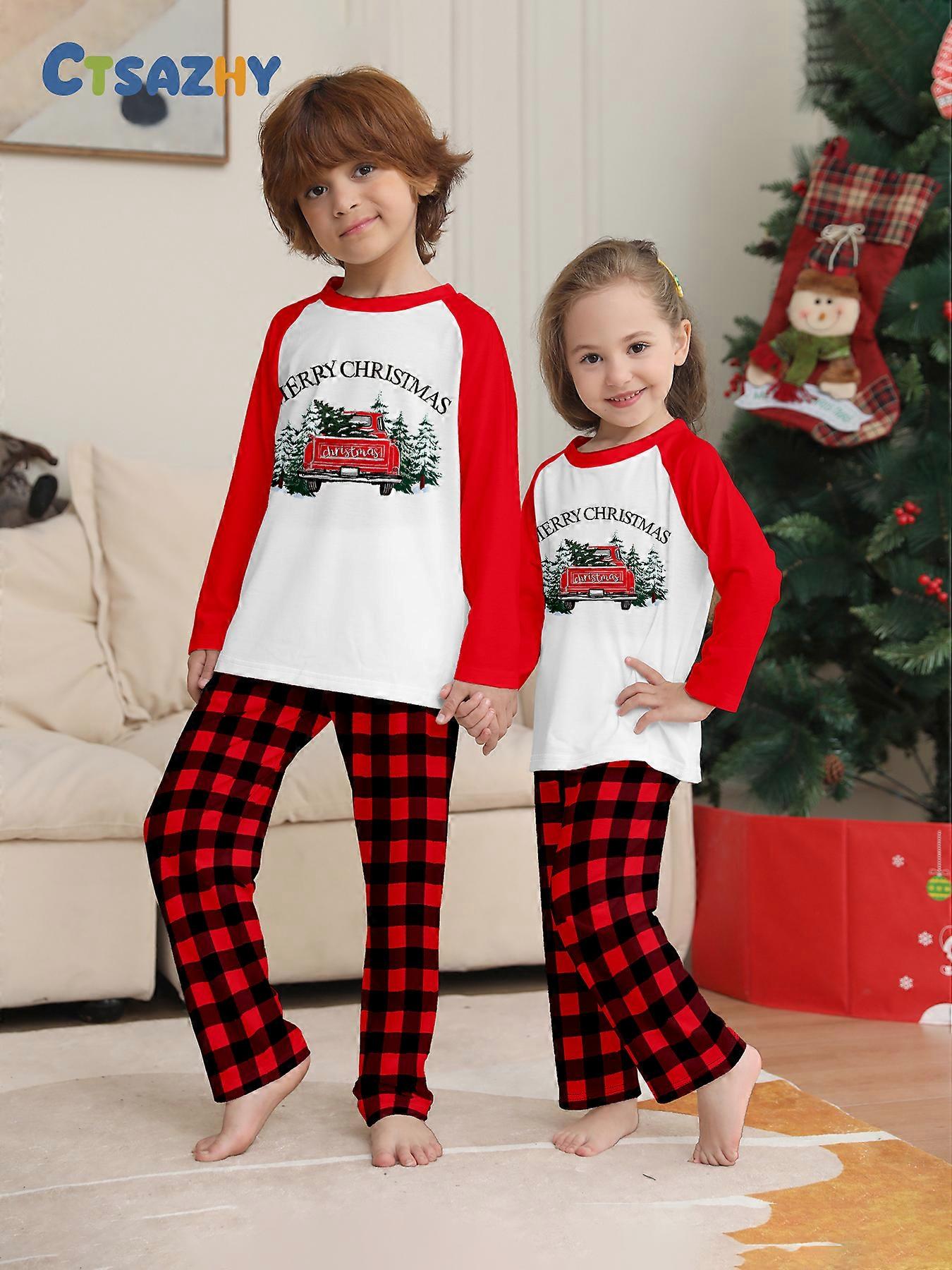 Christmas Children Sleepwear Set Merry Christmas Red Truck Graphic Raglan Sleeve Red Black Plaid Pajamas
