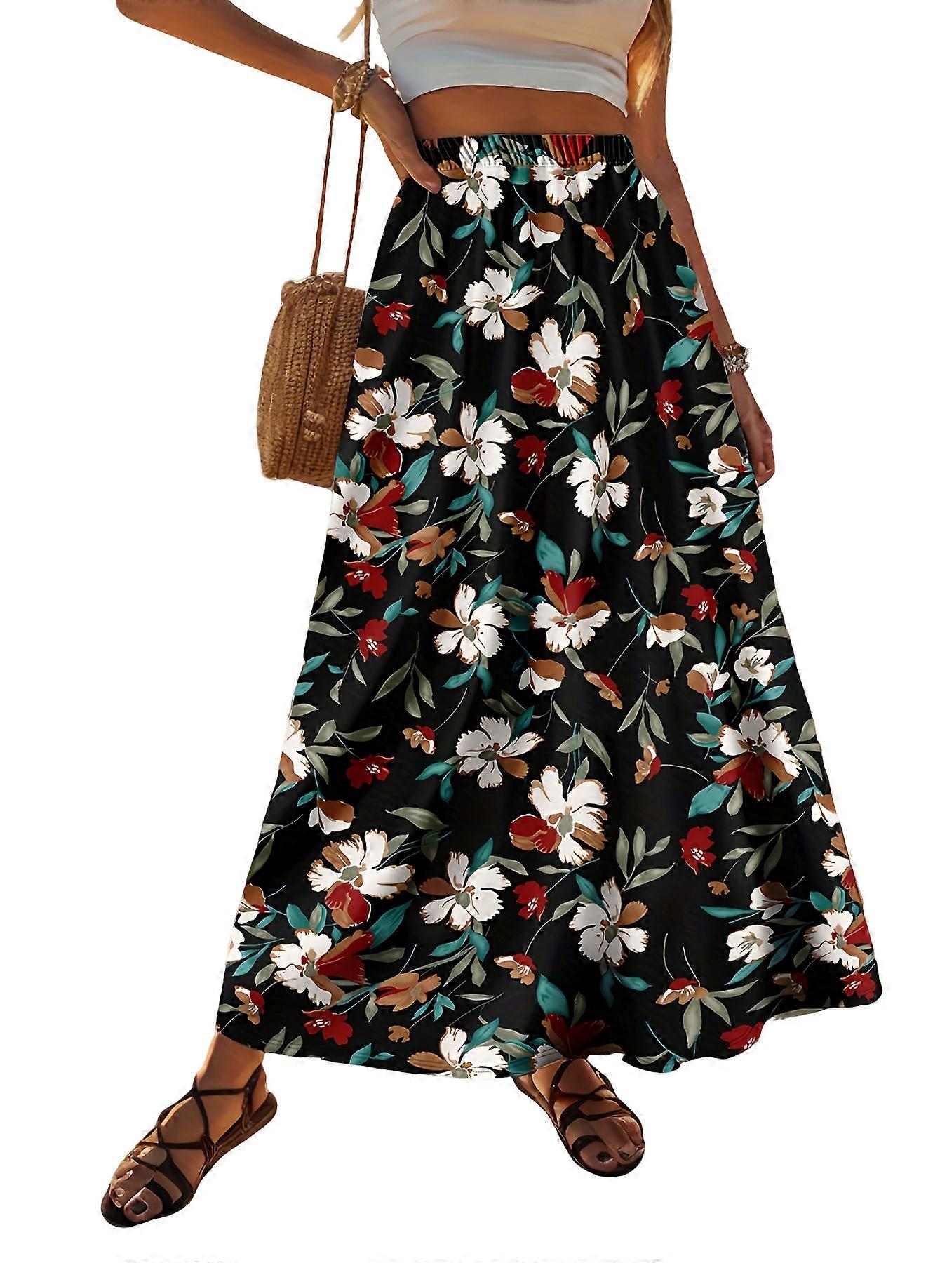 Enchanted Vintage Multicolor Floral Blossom Print Black - Base High - Waist Elastic A - Line Flowy Maxi Skirt