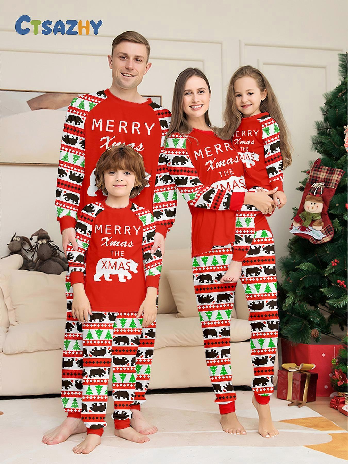 Christmas Family Sleepwear Set "Merry Xmas" Bear Christmas Tree Print Raglan Sleeve Red Pajamas for Boys & Girls