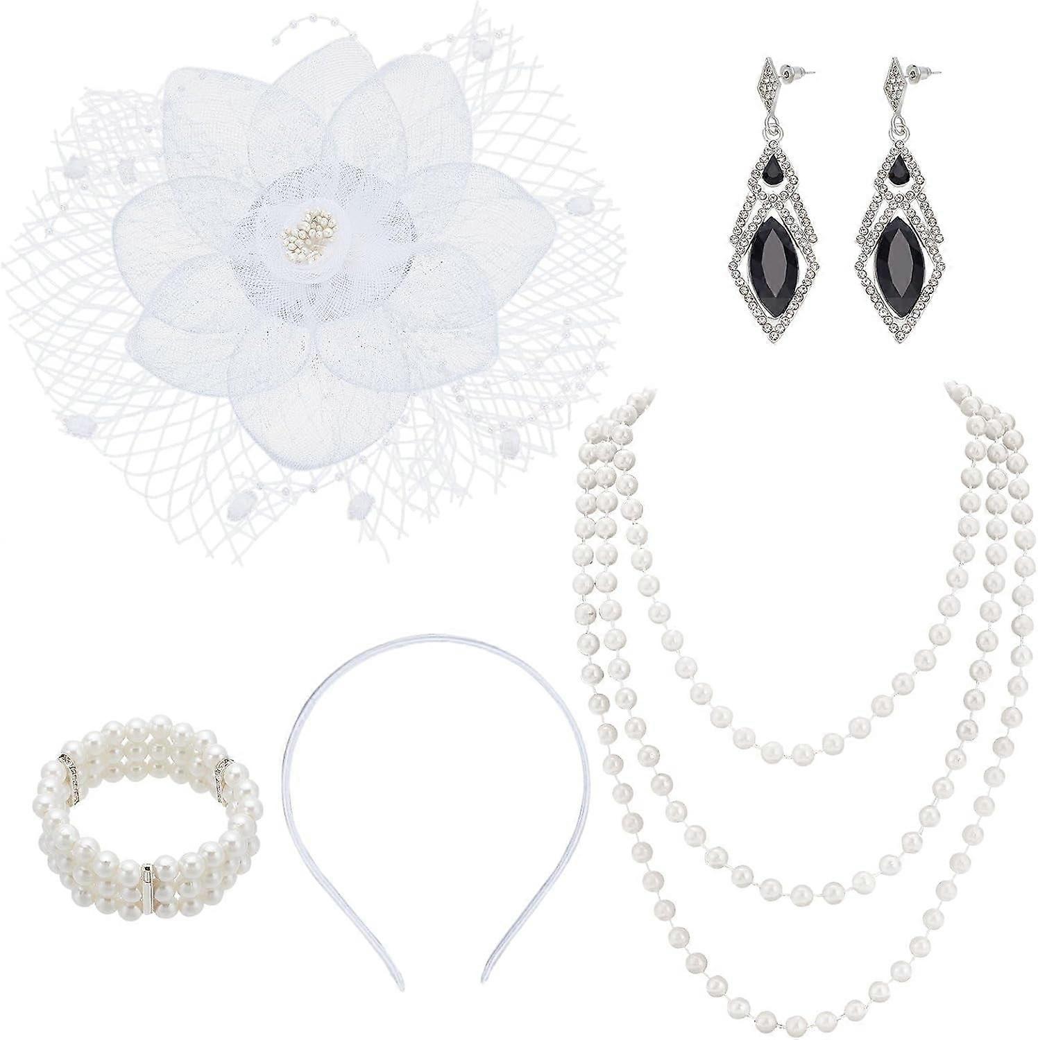 5pcs 1920s Fascinators Hats with Lace Gloves, Pearl Necklace, Bracelet, Earrings, Veil, Mesh Feather Headband Party Accessories for Wedding, Black