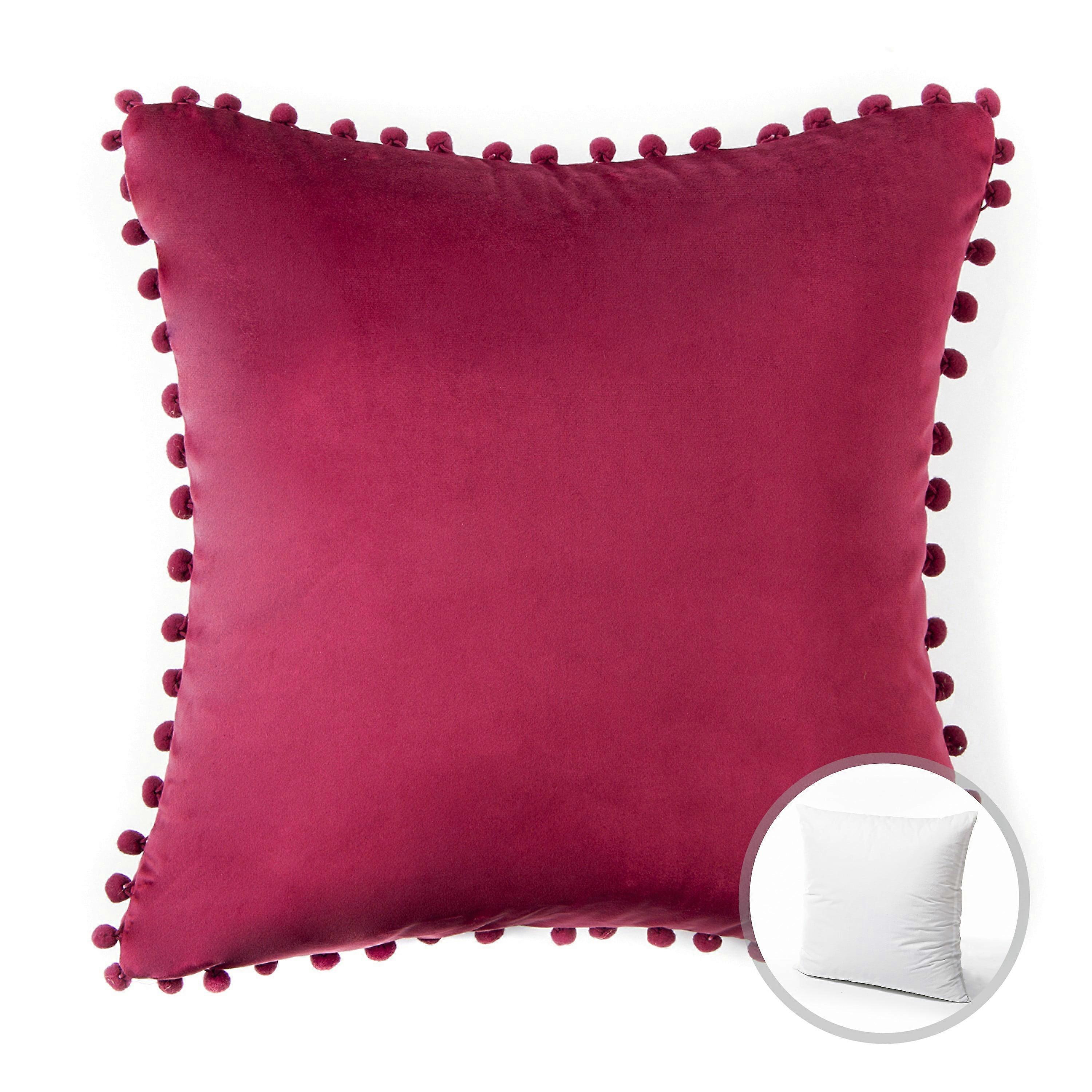 Phantoscope Christmas holiday Decorative Throw Pillow with insert, Pom Pom Velvet Series, 20" x 20", Red, 1 Pack