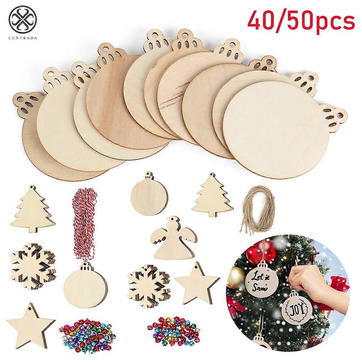 Luxtrada 50 Pcs Wooden Christmas Ornaments, 5 Styles DIY Kids Craft Kit with Strings, Unfinished Wood Slices for Holiday Decor