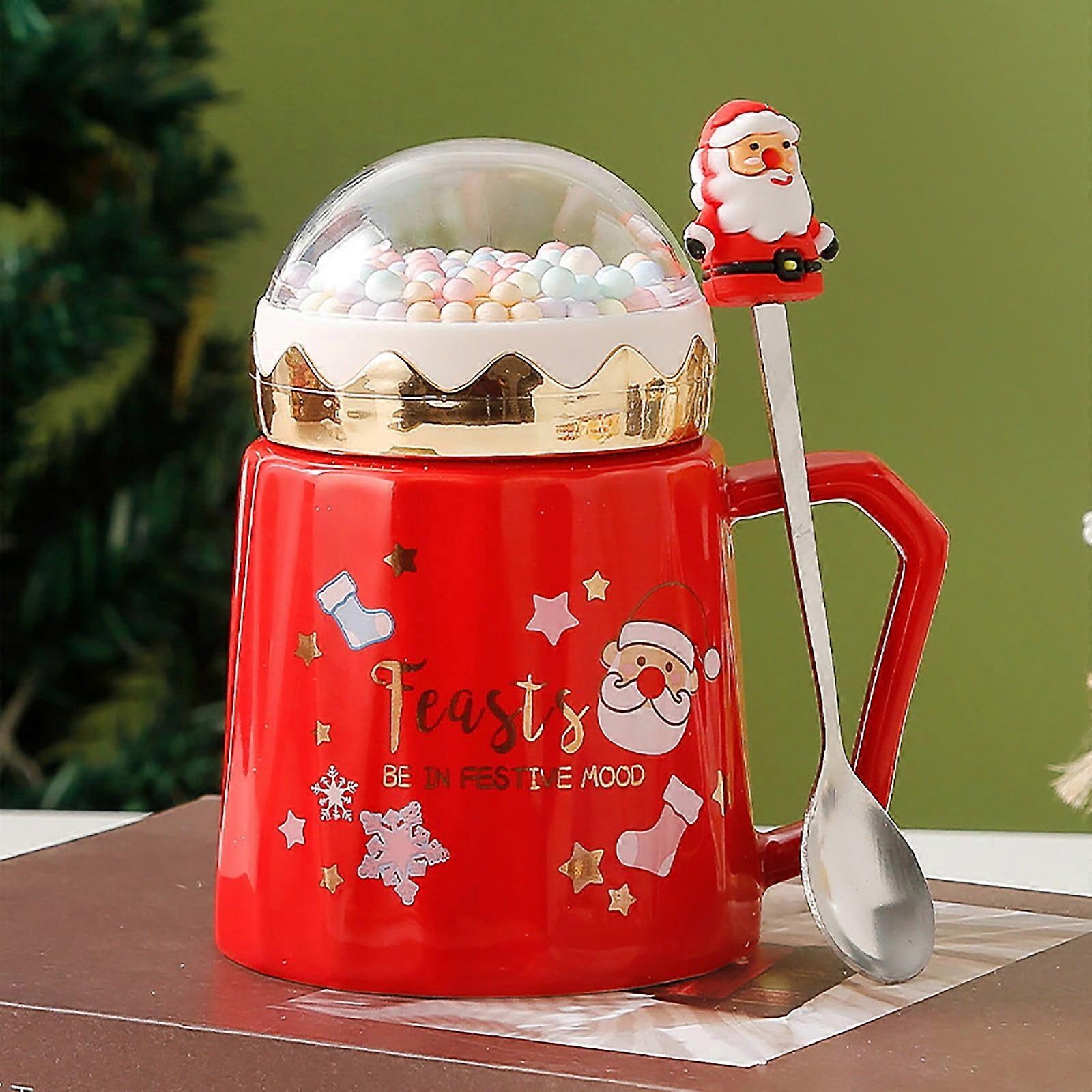 Poaug Glass Bottles & Mugs Set, Compatible with Christmas Gift | 400ml Ceramic Mug with Spoon, Saucer, Santa Hat Lid | Microwave & Dishwasher Safe