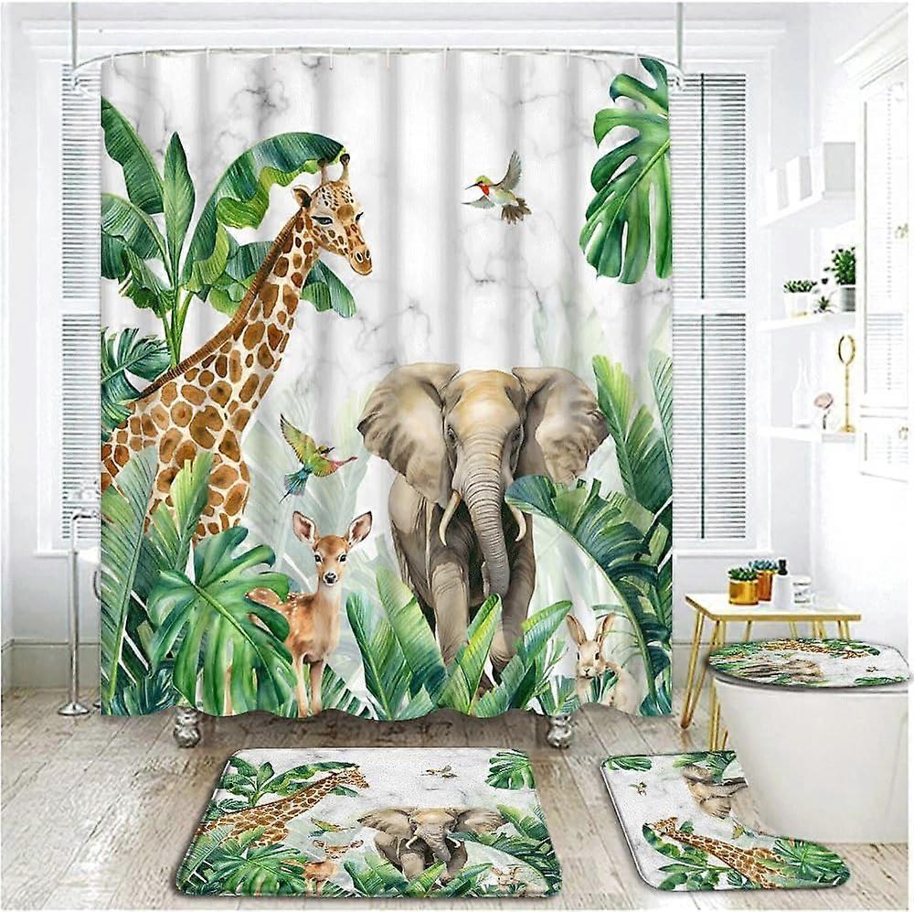 4-Piece Jungle Animals Shower Curtain Set with Rugs & Toilet Lid Cover, Tropical Rainforest Wildlife Elephant Giraffe Deer Bird Green Palm Leaves