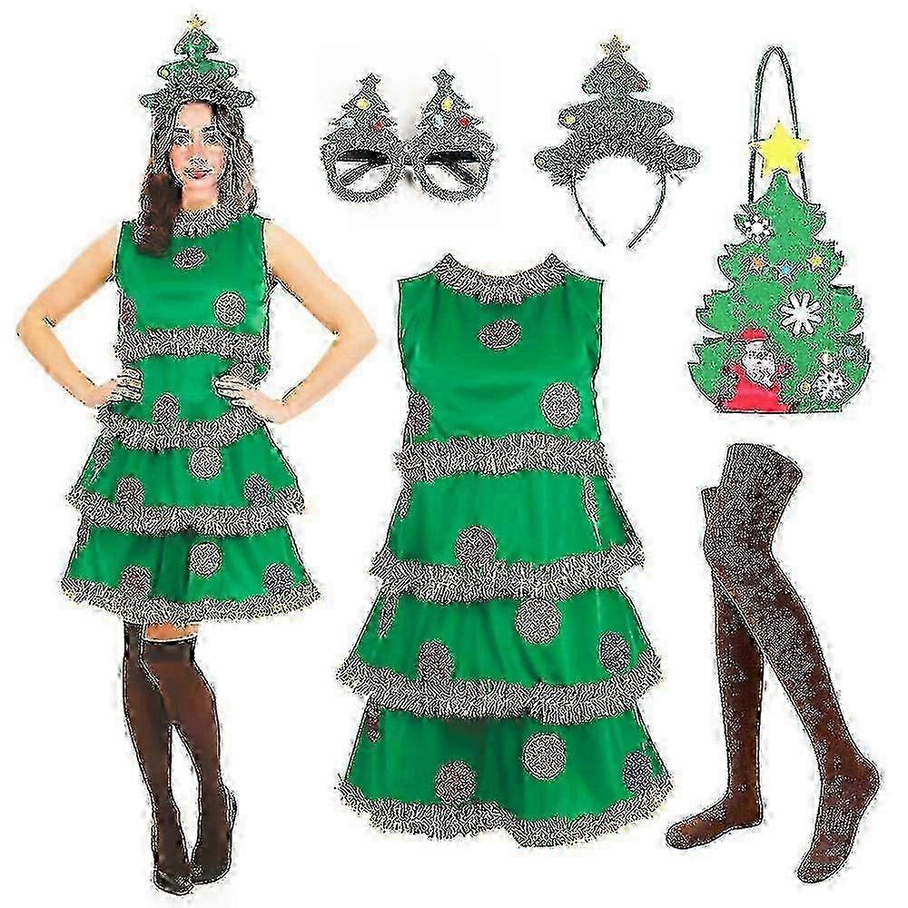 Women's Christmas Tree Costume Set with Dress, Bag, Headband, Glasses and Socks for Cosplay