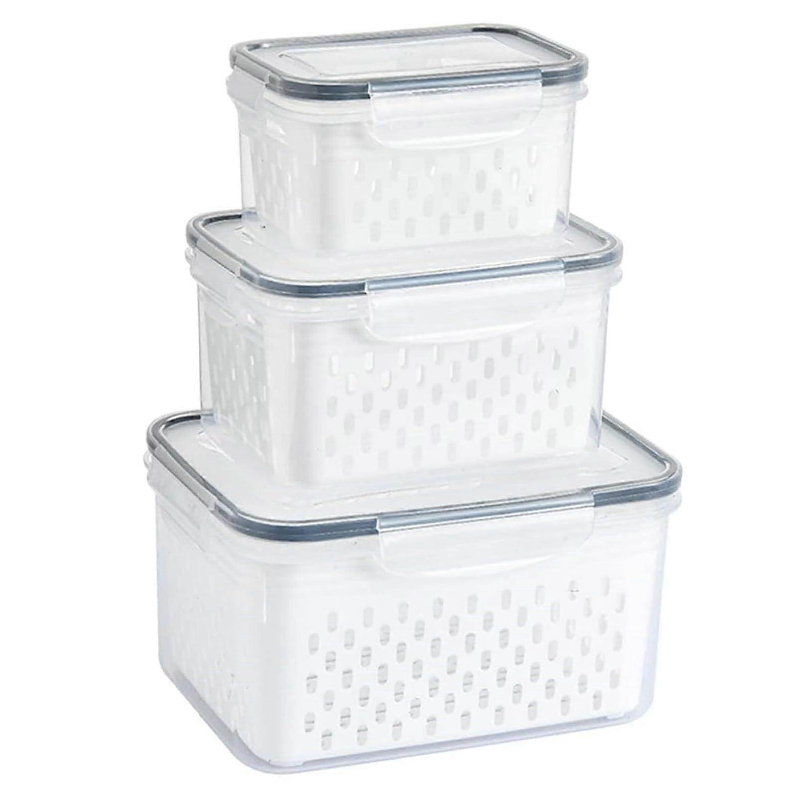 Household Transparent Plastic Food Storage Box Includes Drain Basket Grey Three Piece Set For Fruits And Vegetables