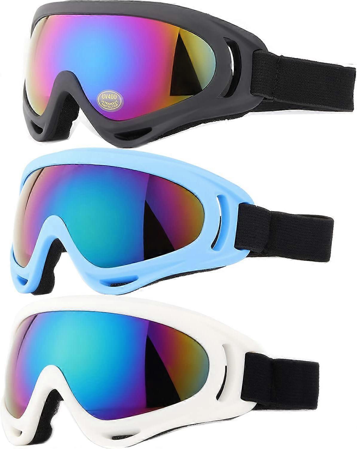 Multi-functional lenses for all weather conditions: Our ski goggle set includes colored, grey, and tan lenses, all with UV protection against UVA and UVB rays, ideal for sunny days. The tan lens enhances visibility in low light conditions, while the clear lens provides optimal clarity on cloudy days. <br>Three-pair pack – suitable for the whole family: The set includes three pairs of ski goggles, each with a different lens or frame color. This multi-functional set is designed for men, women, and children with smaller head circumferences, making it ideal for family outings, ski trips, or winter sports. <br>Durable and easy to care for: Made with high-quality materials, these ski goggles are durable and scratch-resistant. Each pack includes detailed anti-fog and care instructions to ensure your goggles are always in top condition for all your winter adventures. <br>Versatile: These children's ski goggles are not only suitable for skiing but also perfect for snowboarding, winter driving, hunting, tactical outdoor games (CS), motorcycling, or cycling in cold weather. An essential for all your winter outdoor adventures. <br>Comfortable, breathable, and safe: These snow goggles feature durable PC lenses and an ABS frame, providing superior protection and durability. Anti-fog channels on both sides enhance breathability and prevent sweat from fogging the lenses. Thick, soft foam ensures a comfortable and snug fit even during extended wear.