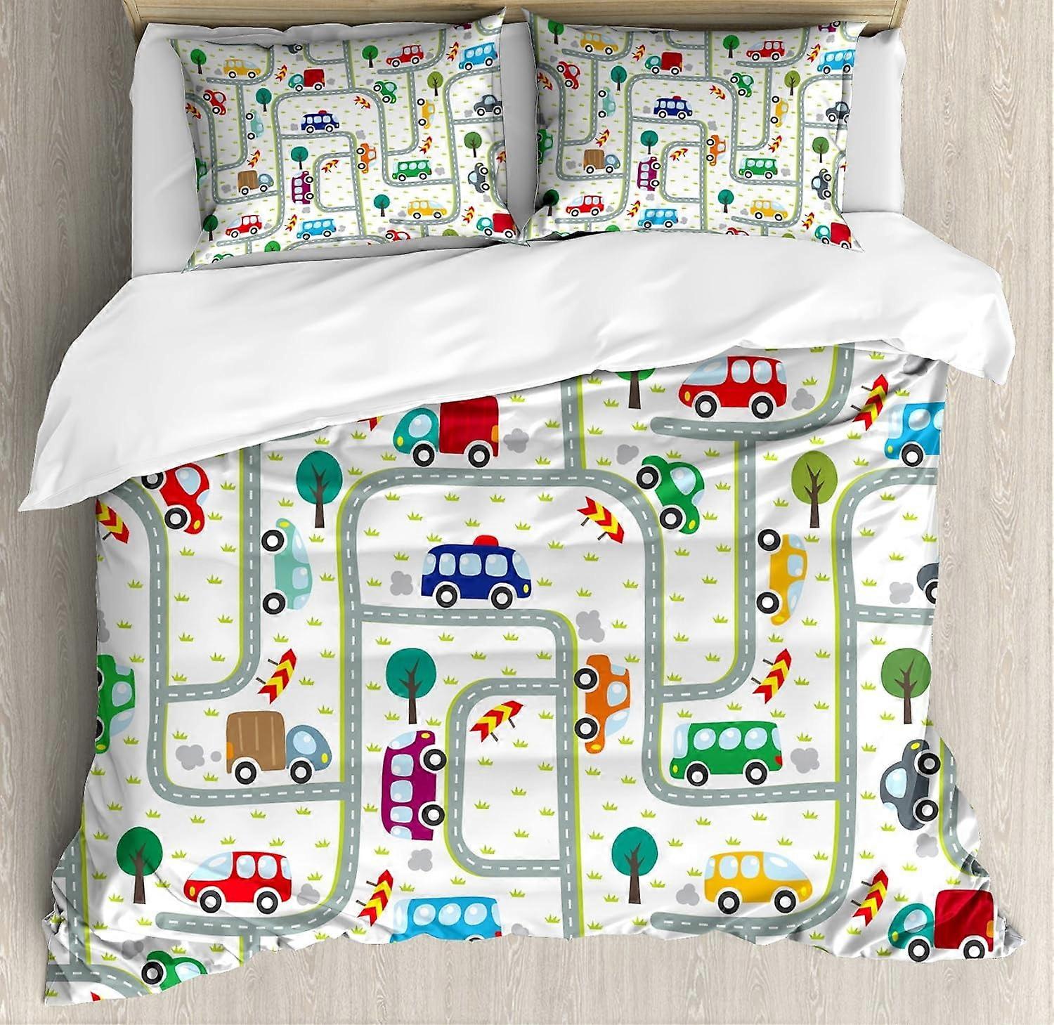 Cars Duvet Cover Set, Vibrant City Driving Design, 3-Piece Bedding with 2 Pillowcases, Green Gray