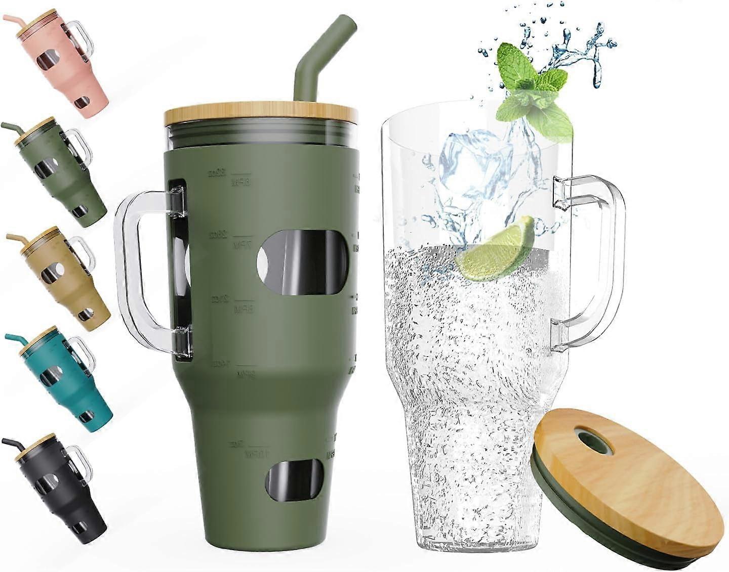 32 Oz Glass Tumbler with Handle, compatible with car cup holders, leakproof bamboo lid, straw, silicone sleeve, time marker, BPA free, OliveDrab