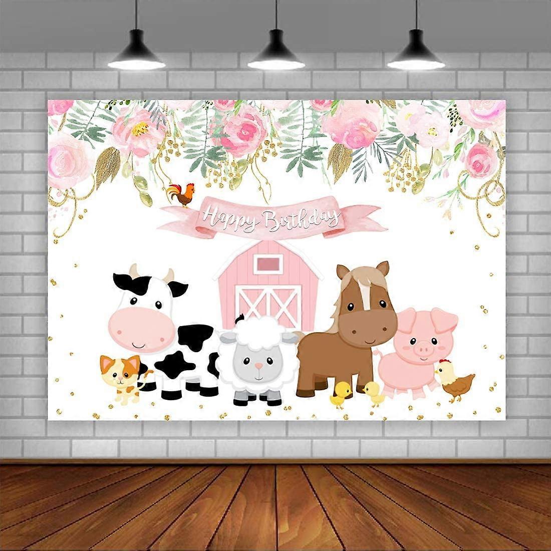 Pink Farm Animals Birthday Backdrop 5x3ft, Compatible with Little Princess Barnyard Theme, Cute Farmhouse Flower Girls Cake Table Banner Decor