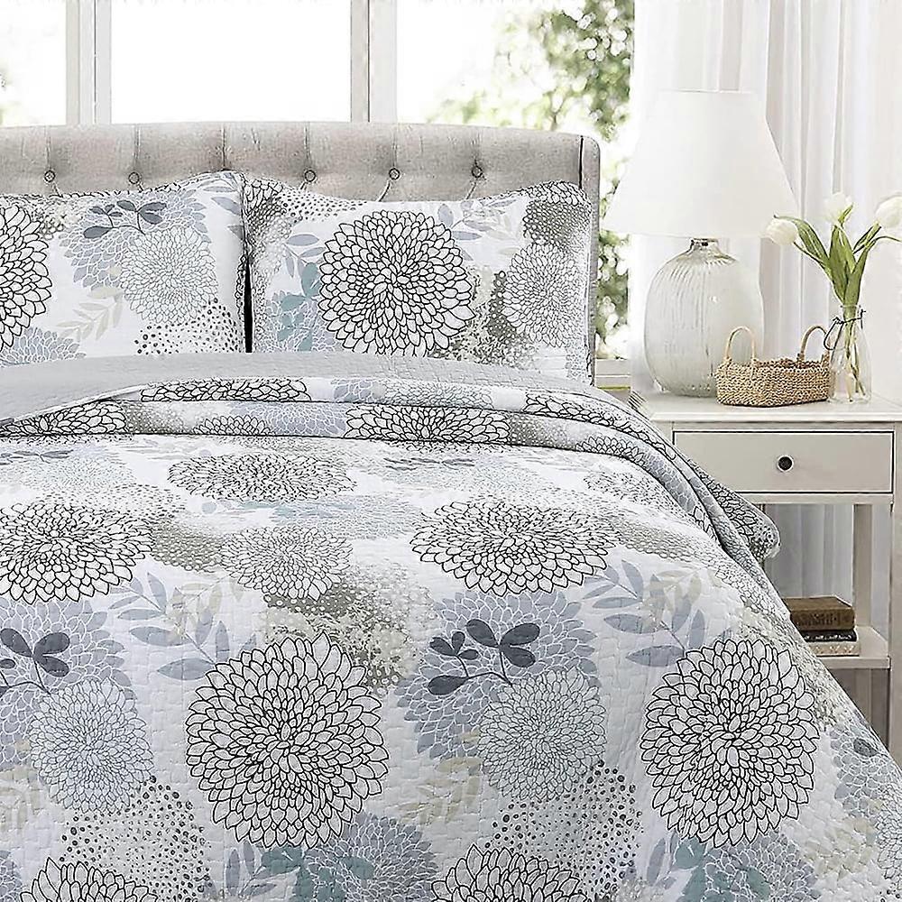 Aqua Blue Tape Floral Print Cotton Reversible Quilt Bedding Set, Bedspread Coverlet, Queen - 3 Piece