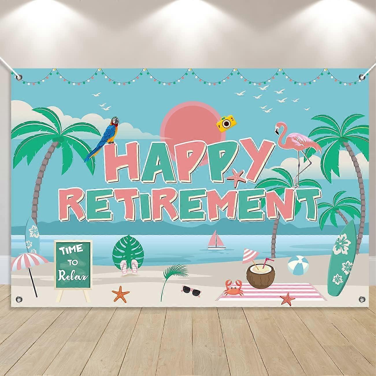 BEACH RETIREMENT PARTY BANNER: Time to relax! The retirement party banner is summer beach themed and our photo backdrop is elaborate and very colorful with palm leaves, flamingos, coconuts and more, which adds most of the flair to the party. it can be folded for easy storage and easy to carry. LARGE SIZE: The retirement banner is 5*3ft in size, so you can see it at a glance even from a distance. 4 corners are already perforated for you to hang it up easily. When your guests and friends go in to the party, it can attract everyone's attention at the first time. DURABLE MATERIAL: The retirement party banner is made of durable Polyester fiber. One-sided high-definition dip-dye printing, clearly visible from front and back WIDELY USED: Summer beach retirement backdrop is ideal for retirement party decorations, widely used to decorate your family retirement party, coworker retirement party, goodbye party, farewell party, and is the perfect complement to other retirement decorations. RETIREMENT GIFT: Retirement backdrop is a retirement gift for your boss, colleagues, teachers and friends that will show your love and leave them surprised and touched.