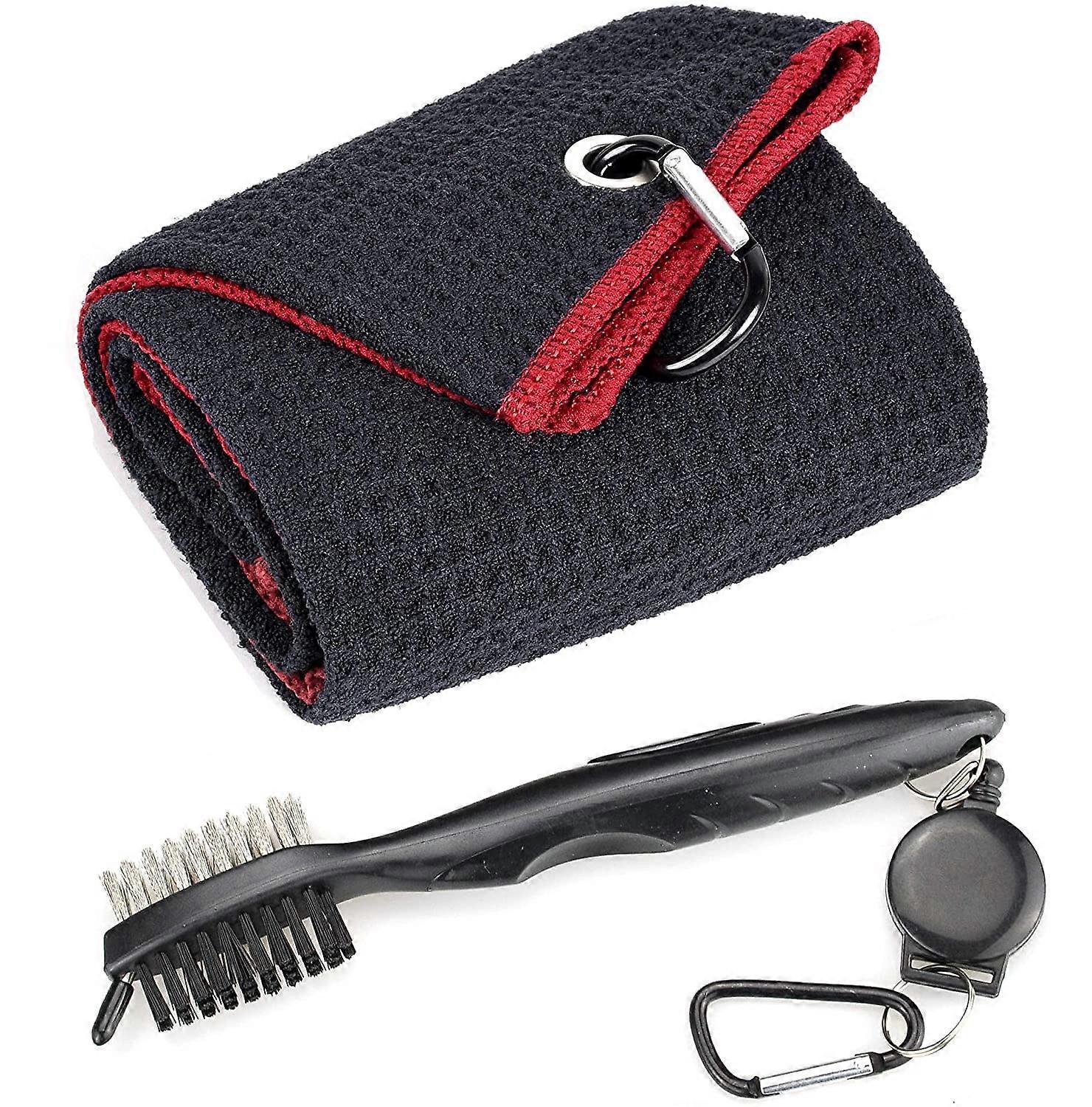 LNGOOR Golf Towels, Microfiber Tri-fold with Brush & Clip, compatible with golf clubs - Waffle Pattern Cleaner Tool Kit, Black