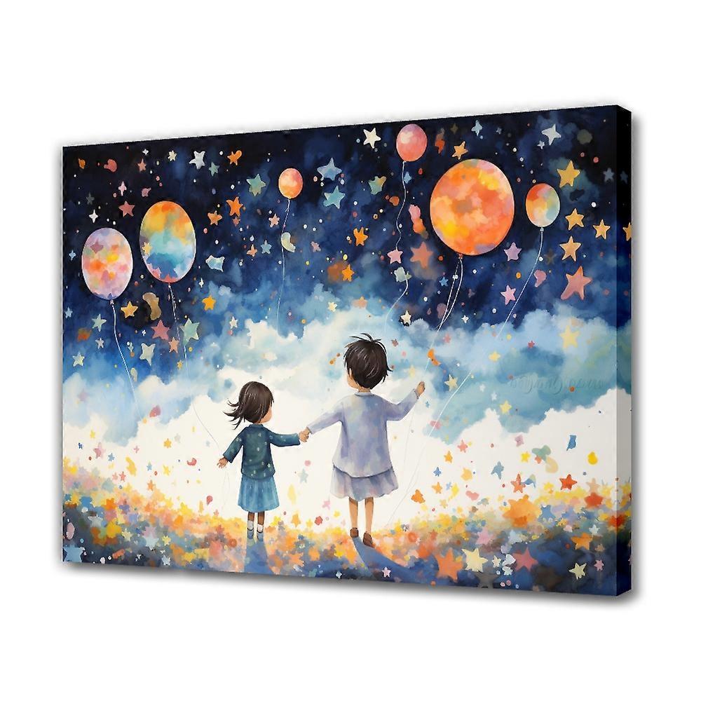 Two Kids Dancing With Balloons In The Night Sky Canvas Poster Bedroom Decor Sports Landscape Office Room Decor Gift,Frame-style,08x12inch(20x30cm)