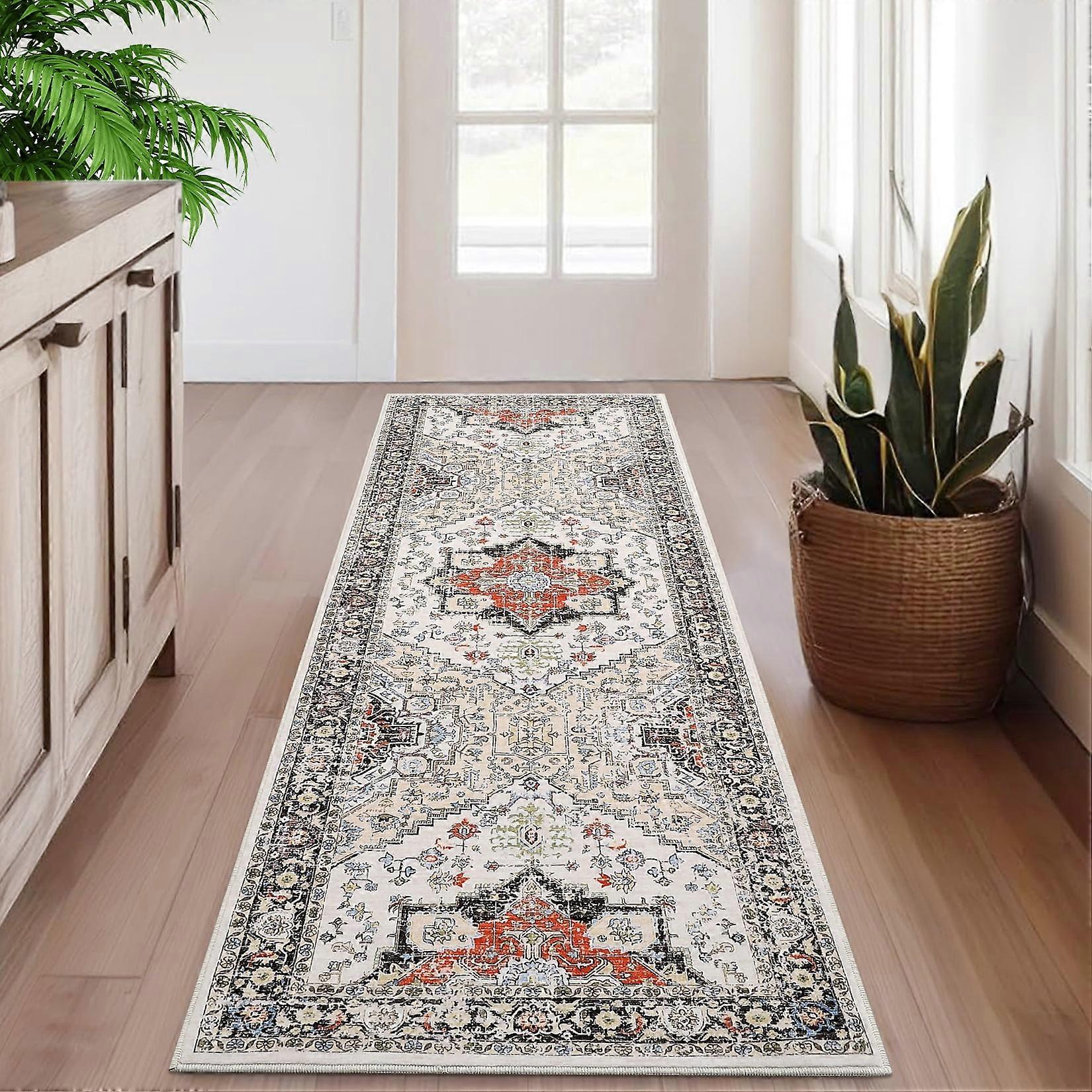 Haperlare Washable Runner Rug, 2' x 6' Beige, Vintage Floral Oriental Design, Non-Slip Soft Carpet for Living Room or Bedroom