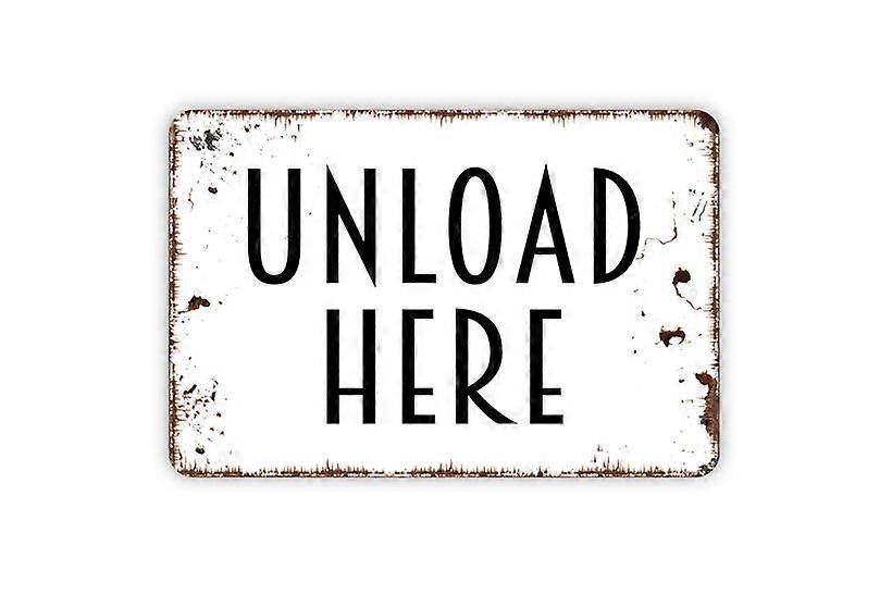 (Aluminum metal) Unload Here Sign Metal Sign Farmhouse Contemporary Modern Wall Metal Sign Size: 16 x 12 Inch