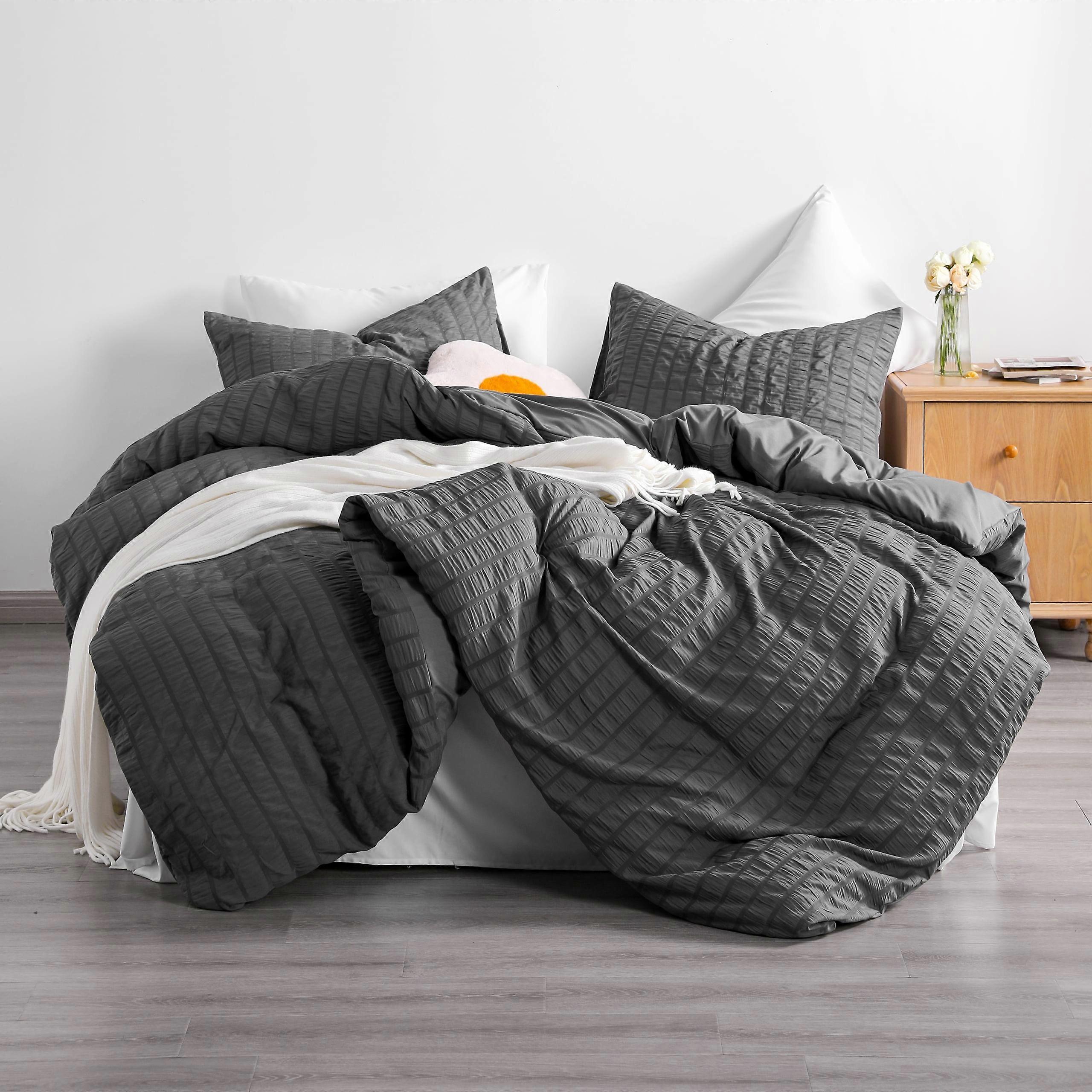 Flxxie Seersucker Textured Duvet Cover Pillow Sham Set with Corner Ties, Queen, Dark Gray, 3-Pieces