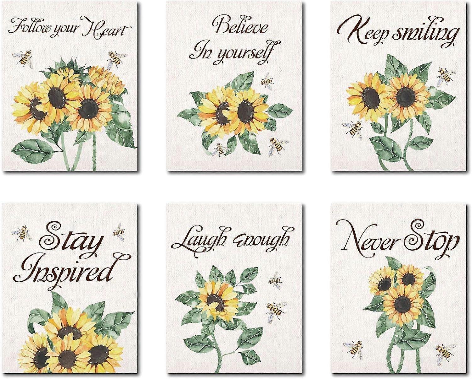 Sunflower Inspirational Wall Art Motivational Art Poster Prints Positive Quotes Daily Affirmations Modern for Men Women Room Home Office Decor Set of 6 Unframed 8x10inch [WARM SUNFLOWERS] Sunflowers symbolizing positive sunshine, inspirational quotes, hardworking bees, quickly warm our depressed hearts and bring happiness to our space. [SIZE] 6pcs x decorative paintings: 8 x 10inch(20.5 x 25.5cm). Warm note: This product is unframed and can be used with your favorite photo frame. [MATERIAL] Our decorative paintings are printed with high-quality 300G coated paper and soybean ink that fully meets environmental standards. Good printing technology makes every card vibrant and colorfast, sturdy and reusable, non-toxic and no odd smell, can use long time. [EASY TO USE] You only need to put our paper printed pictures into your favorite photo frame, then you can get a perfect decoration. [PERFECT GIFT] Our decorative paintings are full of artistic sense and are very suitable as gifts for friends and family. It is very suitable for many occasions, such as living room, bedroom, nursery, classroom, coffee shop, yoga room, etc.