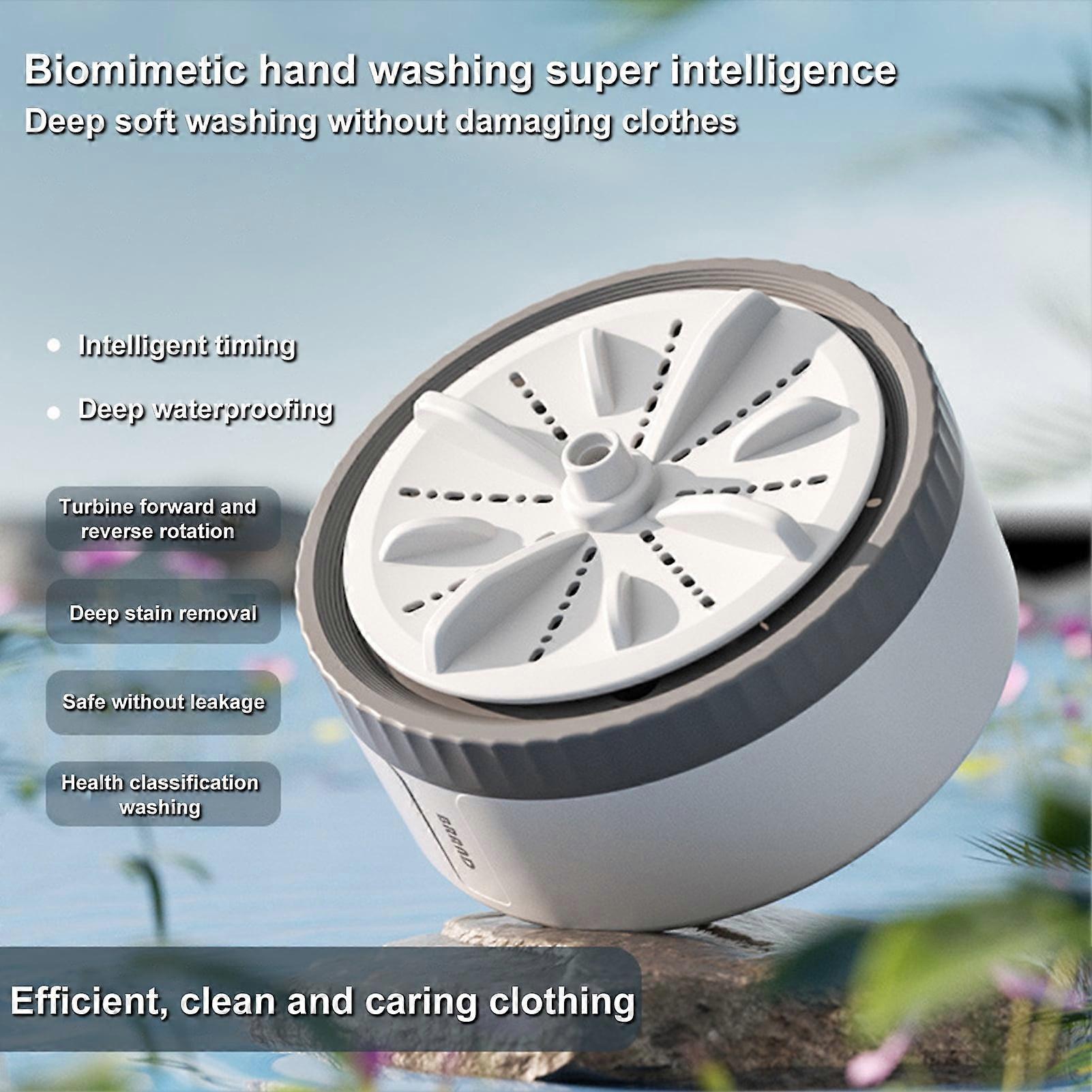 Description: Introducing our mini washing machine, the perfect solution for your laundry needs With its intelligent 3-gear timing feature, you can choose between 10, 20, or 30 minutes of washing time. The automatic power-off function ensures safety and peace of mind. Not only is this mini portable washing machine convenient, but it is also designed to save water and electricity. It is compact, measuring only 12CM/4.7 inches in diameter, making it easy to store when not in use. Whether you're on a personal travel adventure or a business trip, this mini washing machine fits perfectly in a bucket, kitchen sink, or bathroom sink. The multifunctional design of this mini washing machine is truly impressive. Its high-frequency vibration waves accelerate the dispersion of liquids and stains, effectively removing dirt from various items such as socks, underwear, towels, baby clothes, fruits, tableware, and even makeup brushes. Powered by a USB cable, this mini washing machine is incredibly versatile. You can use it wherever and whenever you like without worrying about damaging your clothes. It is suitable for light clothes and personal laundry needs. Item Name: Mini Washing Machine Material: ABS Power Mode: USB Timing Gear: Three Gears Timing Adjustment Input Voltage: 5V Current: 2A Rated Power: 27W Features: Adjustable Timing Gears, Portable, Multipurpose Size Details: L: 12cm/4.72", W: 12cm/4.72", H: 7cm/2.76" (Approx.) Notes: Due to the light and screen setting difference, the item's color may be slightly different from the pictures. Please allow slight dimension difference due to different manual measurement. Package Includes: 1 x Mini Washing Machine The mini washing machine features intelligent 3-gear timing for convenient and safe washing experience (10/20/30 minutes). Water and energy-saving design to minimize environmental impact. Compact size (12CM/4.7 inches) for easy storage and portability. Multifunctional use for various items like clothes, towels, fruits, and tableware. USB powered for flexibility and gentle cleaning without damaging clothes.