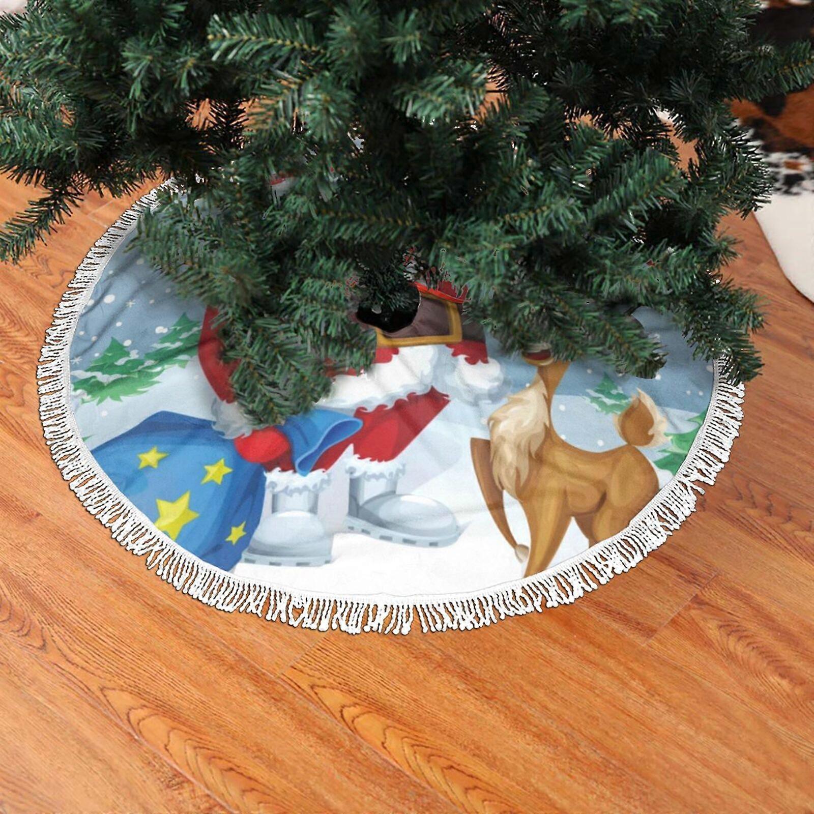 Christmas Fringed Lace Tree Skirt, Christmas Card With Santa And Reindeer Soft, Light, Good Touch Tree Skirt 36"