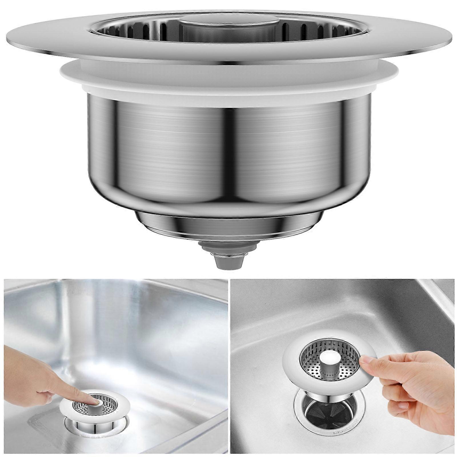 [Multifunctional] The kitchen sink drain strainer is a multifunctional solution for storing and filtering water. Simply press the sink plug and it effectively performs 2 functions: it retains water in the sink. When pressed again, the sink plug pops out and transforms into an efficient filter basket. This innovative design ensures the collection of kitchen waste and prevents clogged pipes