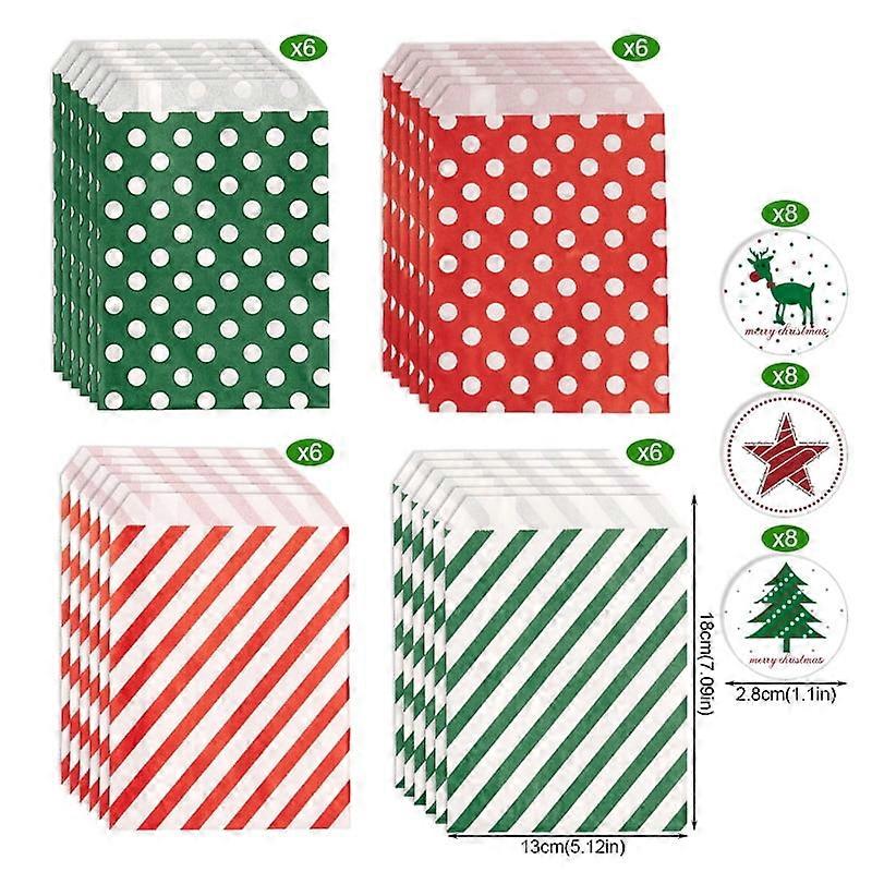 24 Pack Christmas Gift Bags 7.1x5.1 Inch with Stickers, Red Green Candy Design, for Xmas Party, Birthdays, Weddings, Compatible with Holiday Gift