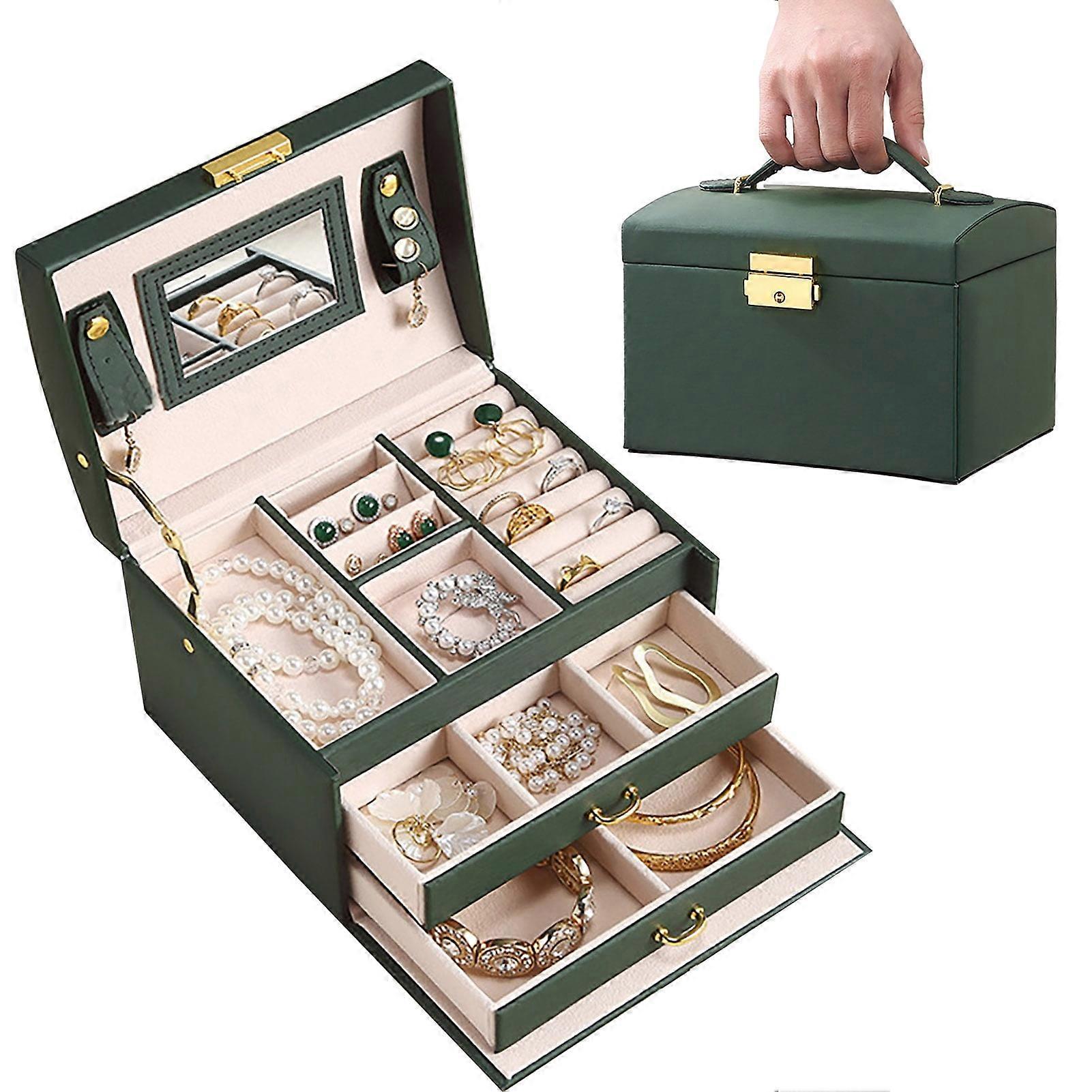 SUSUchens Faux Leather Jewelry Box with Mirror, Portable Handle, 3-Layer Organizer for Earrings, Rings, Necklaces, Bracelets - Atrovirens