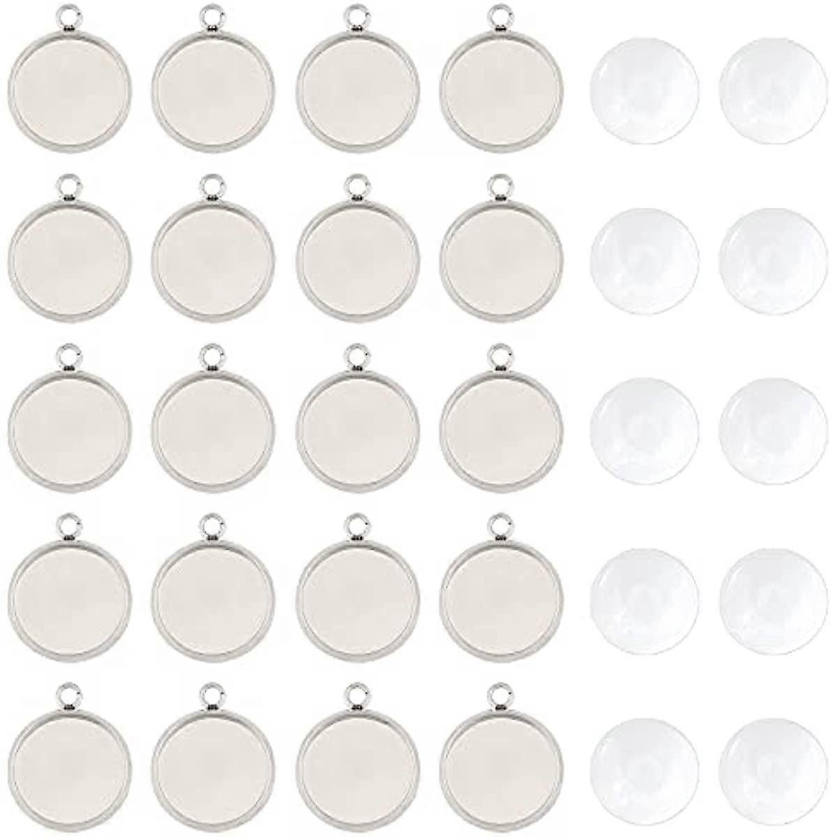 50 Sets 12mm Round Pendants Bezel Blank Tray Stainless Steel Cabochon Settings with Clear Glass for Jewelry Making, Stainless Steel Color