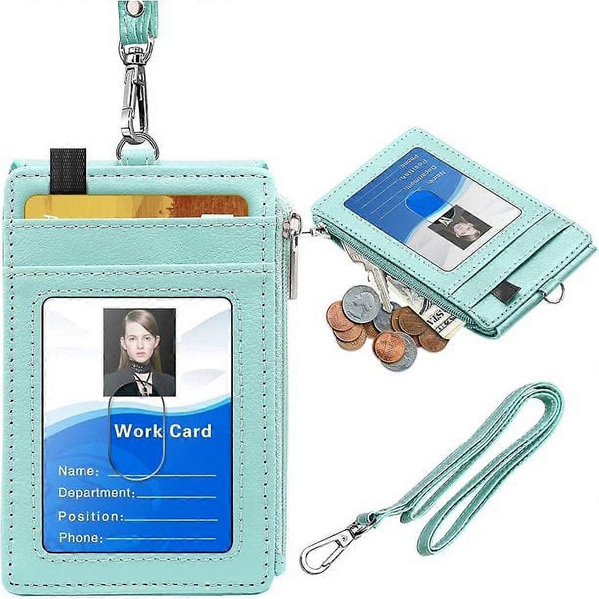PU Leather Badge Holder with Zipper, 5 Card Slots, RFID Pocket & 20" Neck Lanyard - Mint