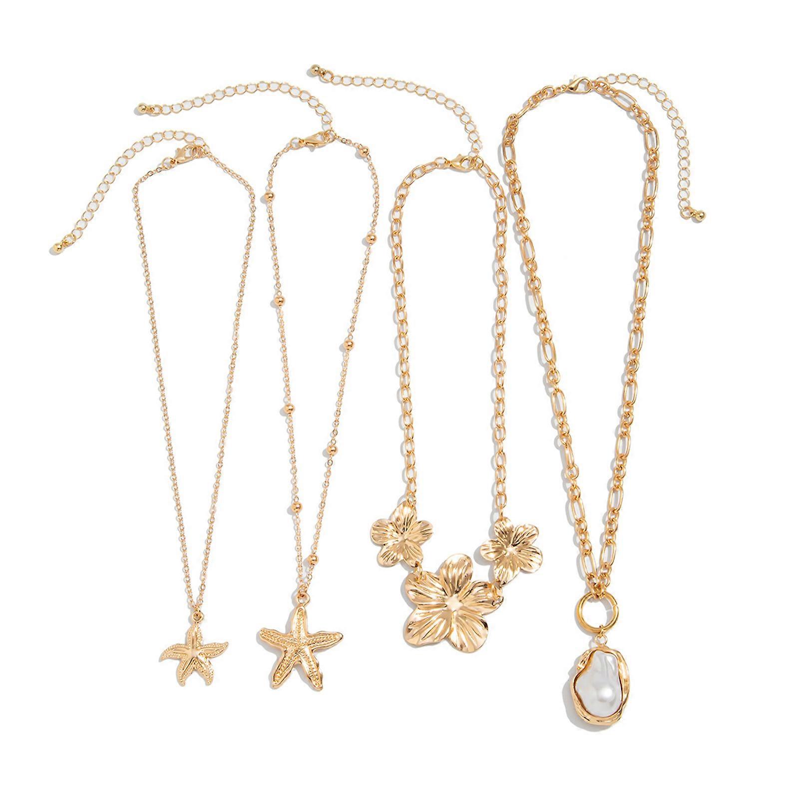 Summer Pearls Starfish Pendant Necklace Set Stackable Gold Chains Coastal Clavicle Chain Jewelry For Casual Wear Multicolor