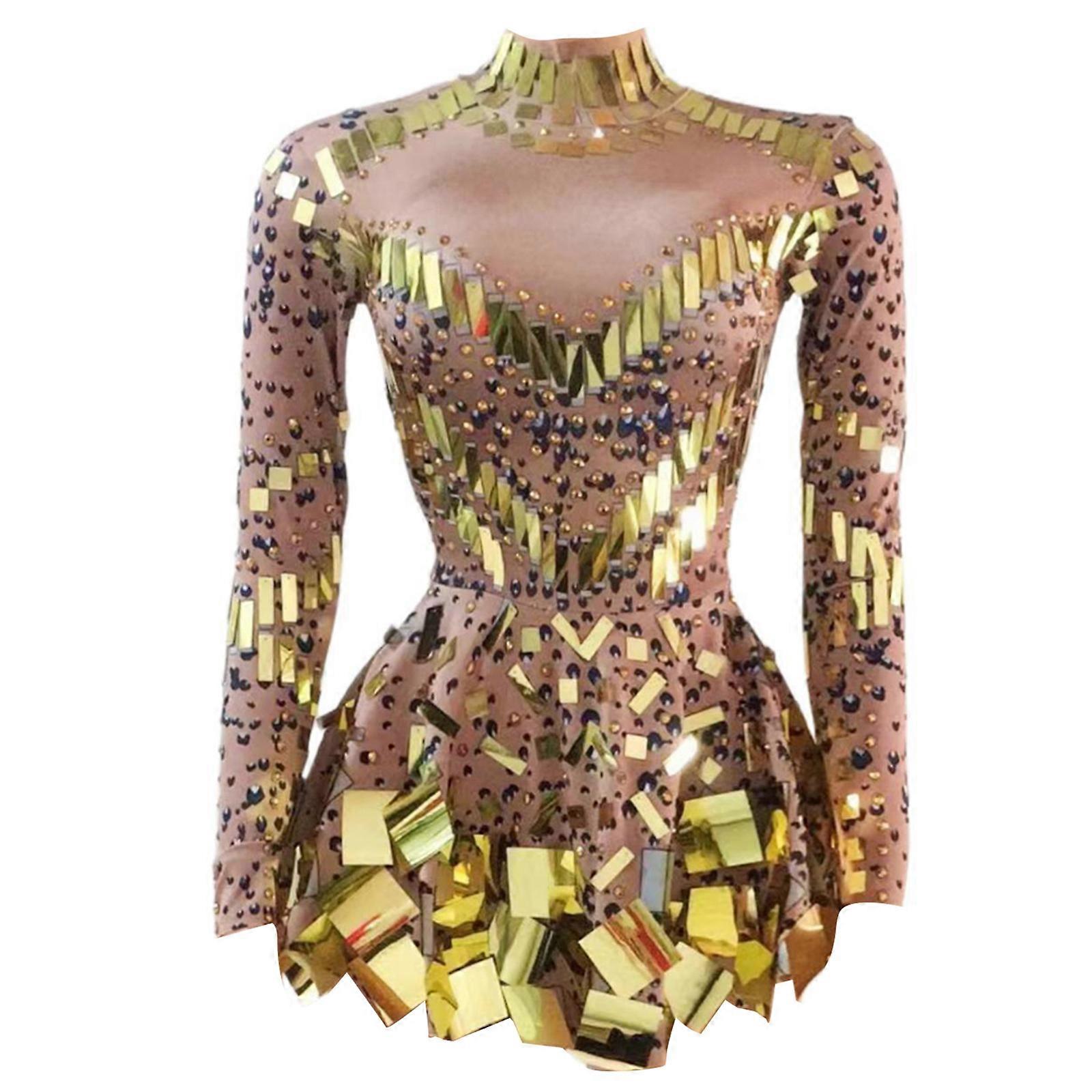Mirror Sequins Dress Long Sleeve Short Dress Sparkly Ballroom Dance Costume Women Stage Wear Rave Dancer Outfits S Brown gold