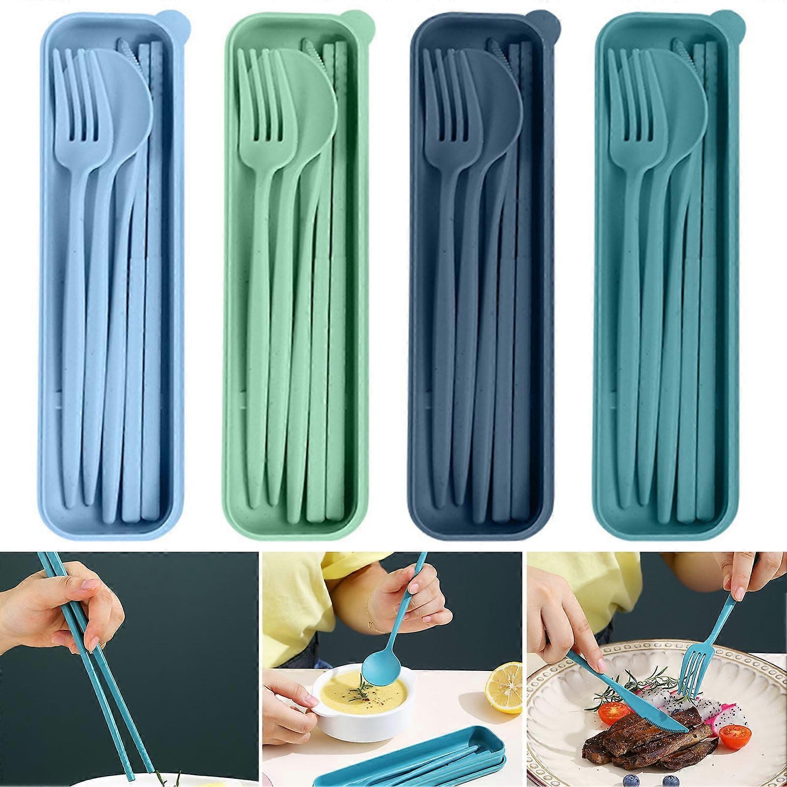 Description: Introducing our utensils set, a must-have for anyone looking for a convenient and eco-friendly alternative to disposable cutlery. Each set includes a cutter, fork, spoon, and chopsticks. Made with high-quality materials, our utensil set is durable and long-lasting. The portable case ensures that your utensils stay clean and organized, making it perfect for travel, lunch boxes, camping, picnics, offices, parties, and more. The multicolor design of the utensils makes it easy to distinguish your own set in a household with multiple users. This not only reduces the constant loss of cutlery but also encourages good organization habits. Our reusable utensils are versatile and can be used to enjoy a variety of meals such as pastries, salads, pasta, and more. They are dishwasher safe for easy cleaning after use. This utensil set also makes for a great gift option. Stylish, lightweight, and practical, it is perfect for loved ones who appreciate both functionality and sustainability. Item Name: Utensils Set Material: Plastic Category: Tableware Style: Modern And Simple Features: Easy to Carry, Reusable, Non-stick Size Details: L: 31cm/12.2", W: 5.5cm/2.17" (Approx.) Package Includes: 4 Sets of Utensils Set (Each Set Includes Cutter, Fork, Spoon, Chopsticks, Storage Case) Reusable utensil set with cutter, fork, spoon, and chopsticks. Portable case for clean and organized storage. Multicolor flatware sets for easy identification and organization. Stylish, lightweight, and dishwasher safe. Size Details: The length of this product is 21cm and width is 5.5cm.