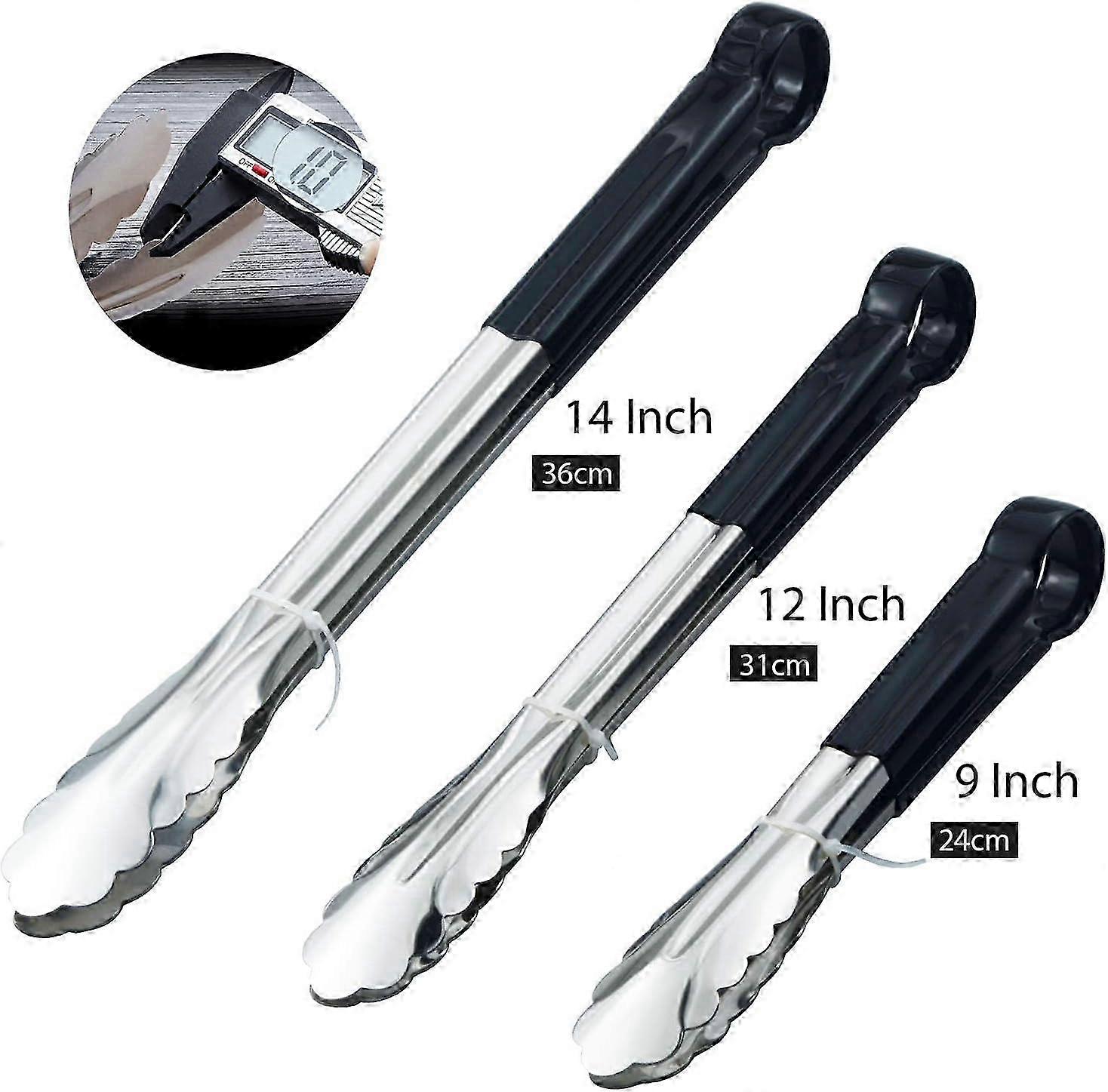 【FOOD-GRADE STAINLESS STEEL AND SOFT HANDLE】kitchen cooking tongs are manufactured from a premium 100% Food Grade stainless steel, safe for food contact. Stable and simple structural design and soft plastic handle with non-slip design for comfortable feel. 【MODERN DESGIN, HEAT RESISTANT AND DISHWASHER SAFE】The well-balanced elastic force and exact force transmission at the end of the tongs enable effortless handling. Soft Plastic handle precisly firmly hold vegetables, fish, and meat when transported to and from the grill. Tongs are hygienic, dishwasher safe and long handle to protect from the heat. 【MULTI-PURPOSE USAGES】Great for taking vegetable, food, meet, cheese, bread, ice and more, One-piece structure, durable and convenient, easy to carry at any place, great for various outdoor activities. 【PACKAGE CONTENT】3 × stainless steel food tongs (Black, 9 12 14Inch)