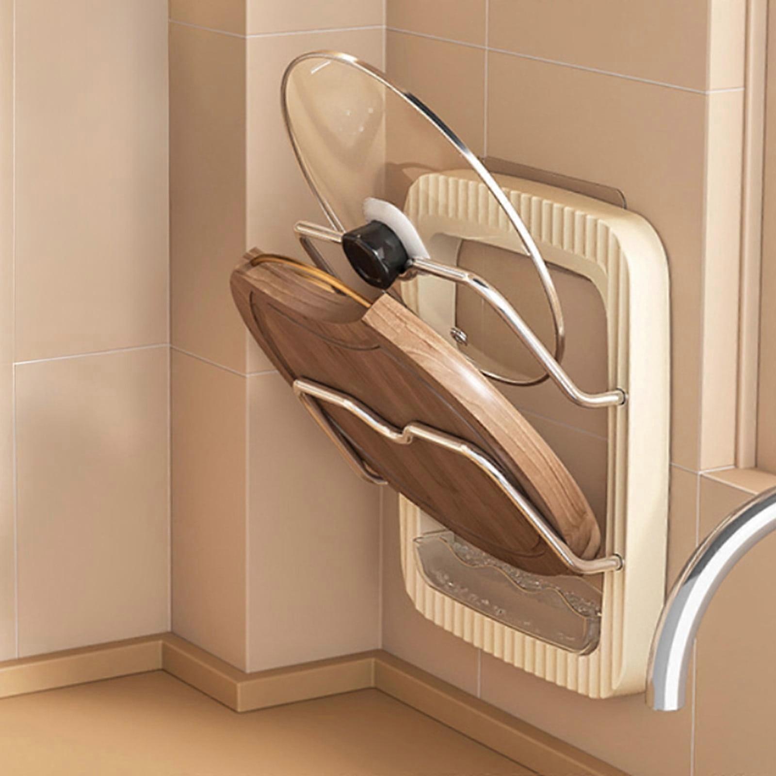 Wall Mounted Pot Lid & Cutting Board Storage Rack, No Drilling, Double Layer, Compatible with Kitchen Cabinet Door/Wall