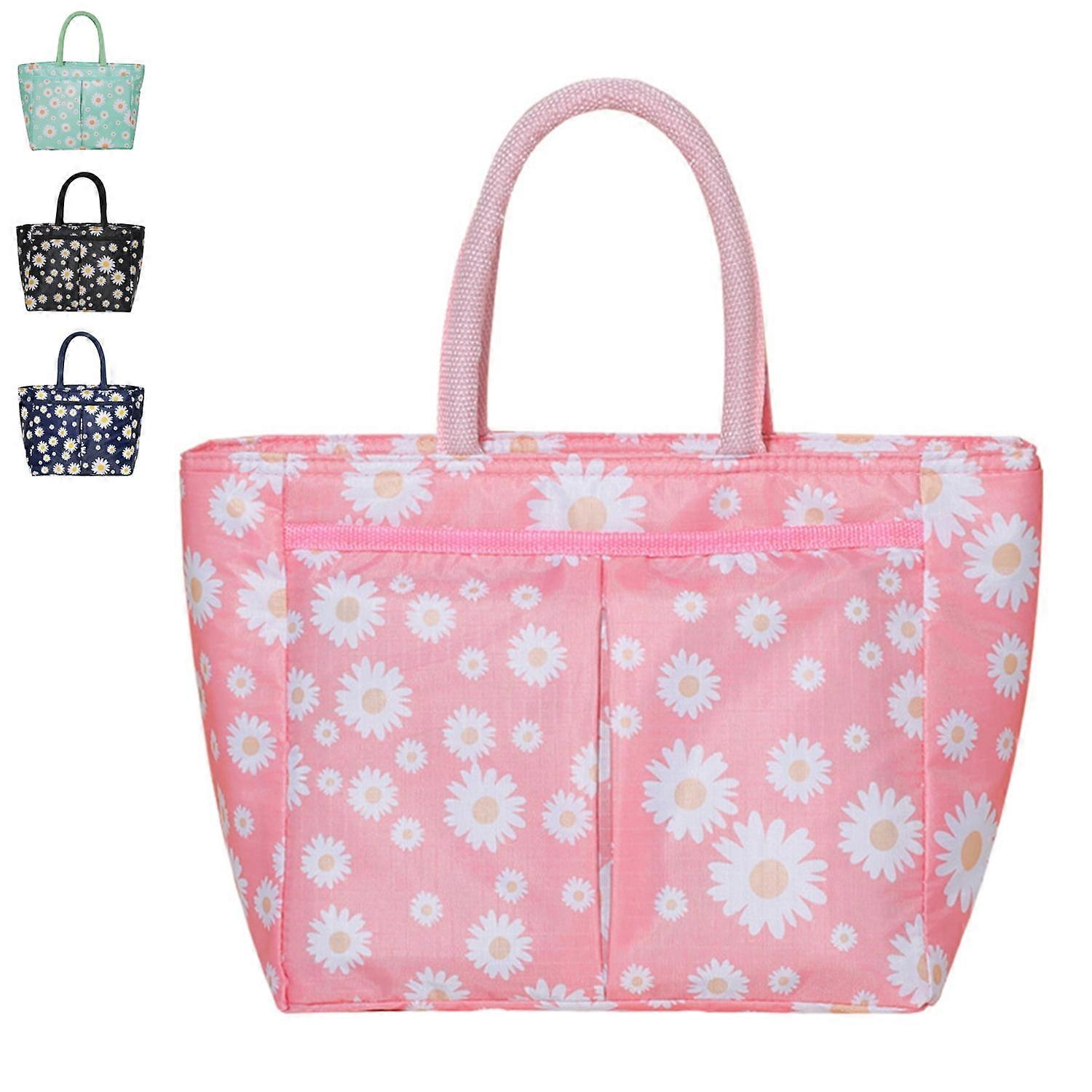 Oxford Cloth Large Capacity Thermal Lunch Bag Daisy Printed Work Food Bento Insulated Pouch Picnic Cooler Bags for School(Pink)