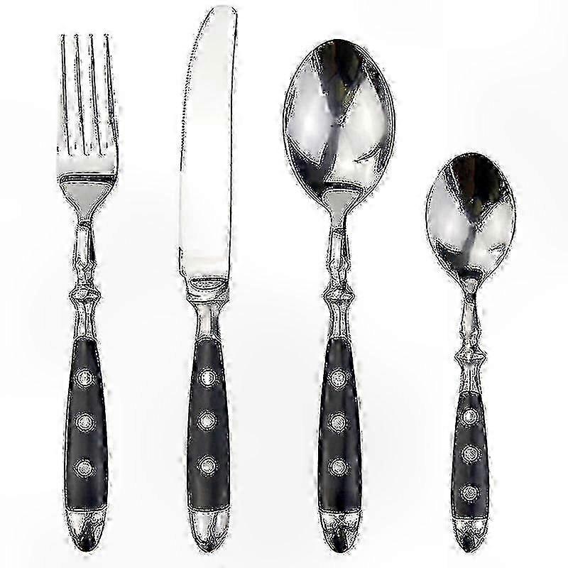 High-quality stainless steel construction ensures durability and corrosion resistance. Ergonomic resin handles with decorative rivets enhance grip comfort and visual appeal. Dishwasher-safe design simplifies cleaning while maintaining surface integrity. Complete set includes dinner knife, fork, spoon, and salad fork for versatile meal service. Suitable for daily home use, outdoor picnics, restaurant settings, and special occasion gifts. Neutral detergent recommended for cleaning; avoid abrasive materials and harsh chemicals. Product dimensions carefully measured for functional tableware proportions and easy storage.
