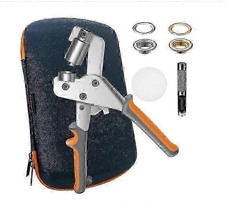 Feature 1Long-lasting Durability: Constructed with stainless steel, ensuring resistance to corrosion and longevity, making it a reliable choice for extended use. 2Effortless Operation: Designed for convenience, the eyelet tool features an elastic device that automatically returns when pressed, labor-saving and efficient. It also boasts a magnetic function for added ease during operation. 3Streamlined Process: The grommet maker kit eliminates the need for pre-drilling. It comes with a hole puncher and backer block, allowing for direct application and efficient hole-making, streamlining your crafting or repair process. 4Versatile Application: Perfect for various materials and projects, including banners, tarps, clothing, bags, cardboard, tents, and more. 5Comprehensive Package: The grommet tool kit includes everything you need a tool bag, a grommet plier, 100 sets each of silver and gold grommets, a hole puncher, and a backer block for neat and efficient work. Item Name: Grommet Tool Kit Main Material: Stainless Steel Product Color: Black and Orange Package List 1 * Grommet Plier 100 * Silver Grommets 100 * Gold Grommets 1 * Hole Puncher 1 * Backer Block 1 * Tool Bag