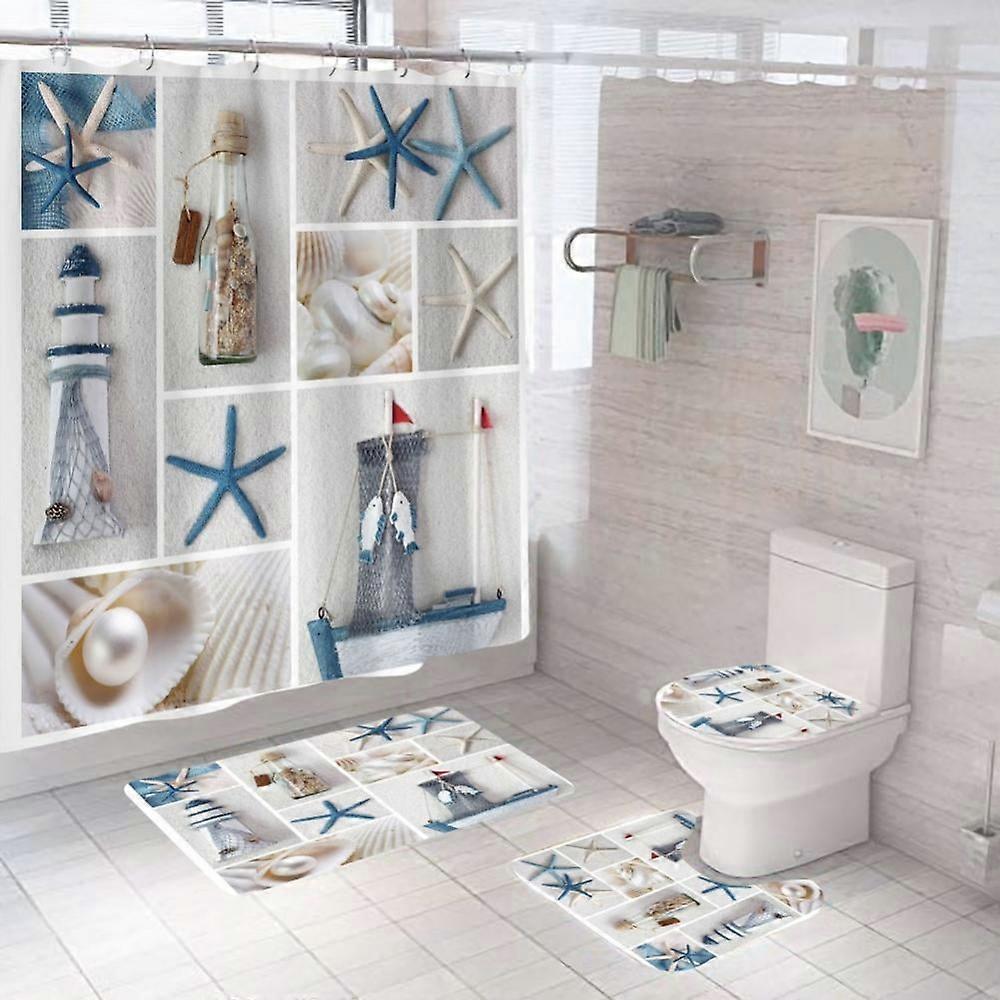 4-Pc Shower Curtain Set: Summer Seashells & Sand Beach Design, Non-Slip Rugs, Toilet Cover & Bath Mat, Waterproof Decor
