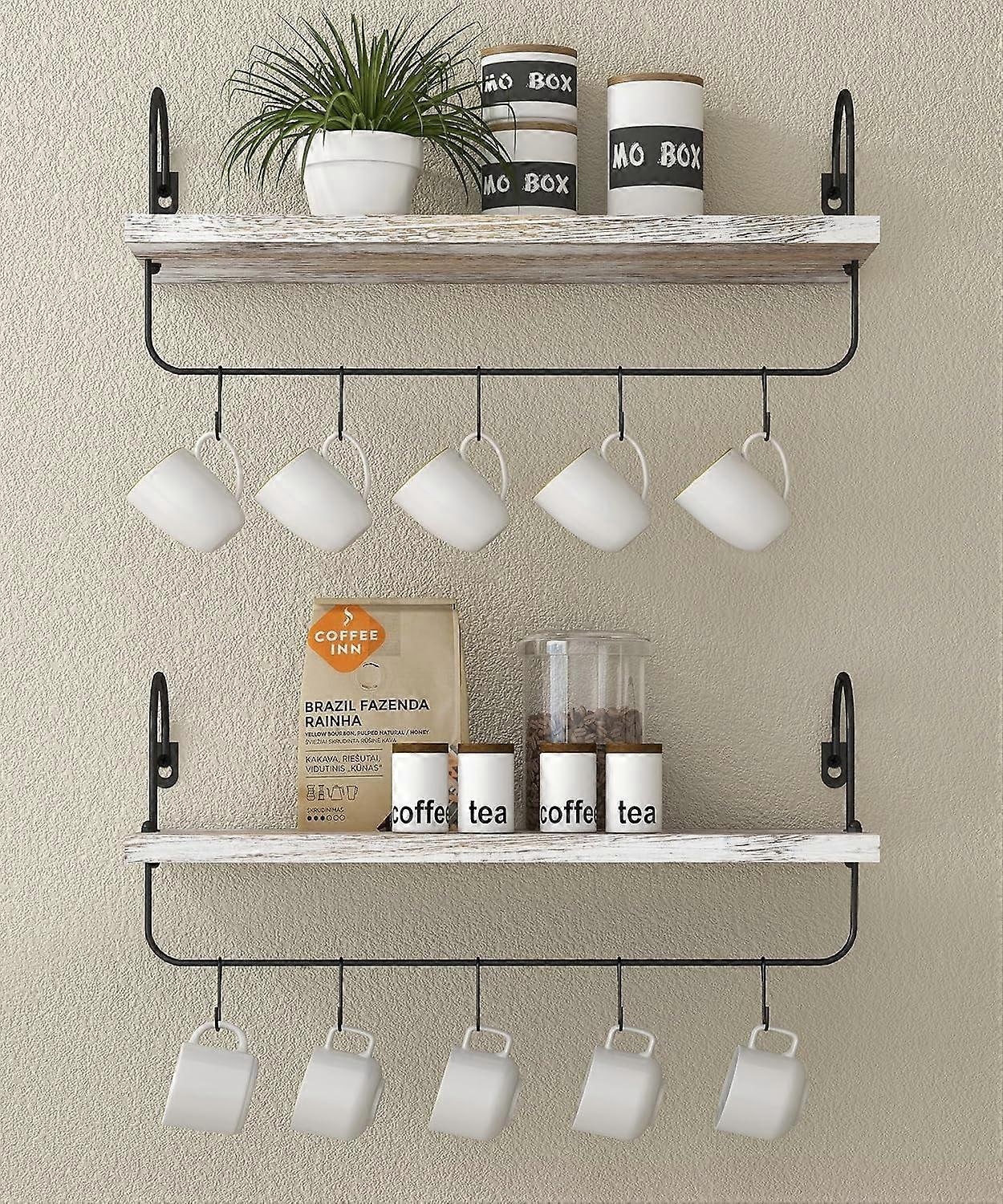 Coffee Mug Holder, Coffee Bar Shelf with Hooks Wall Mount Cup Organizer Mug Racks Coffee Pods Storage Hanger Farmhouse Kitchen Decor, White