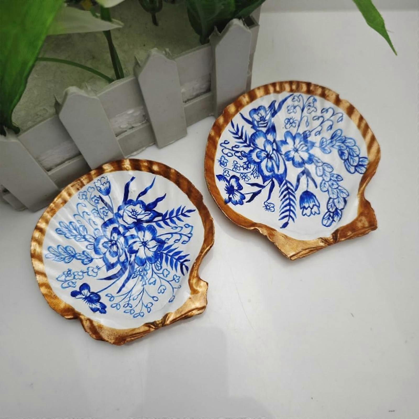 Yakbaofuo Scallop Trinket Dish, Blue Floral Jewelry Holder, Chinoiserie Decor, Compatible with Millennial Home Decor, Beach & Holiday Desktop