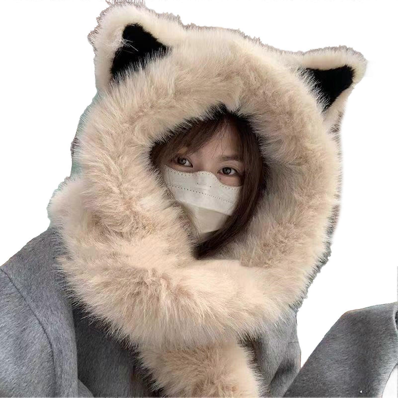 Women Hat Fox Ear Shape Thickened Plush Warm Winter Hat with Scarf Design Outdoor Activities Warm Headwear